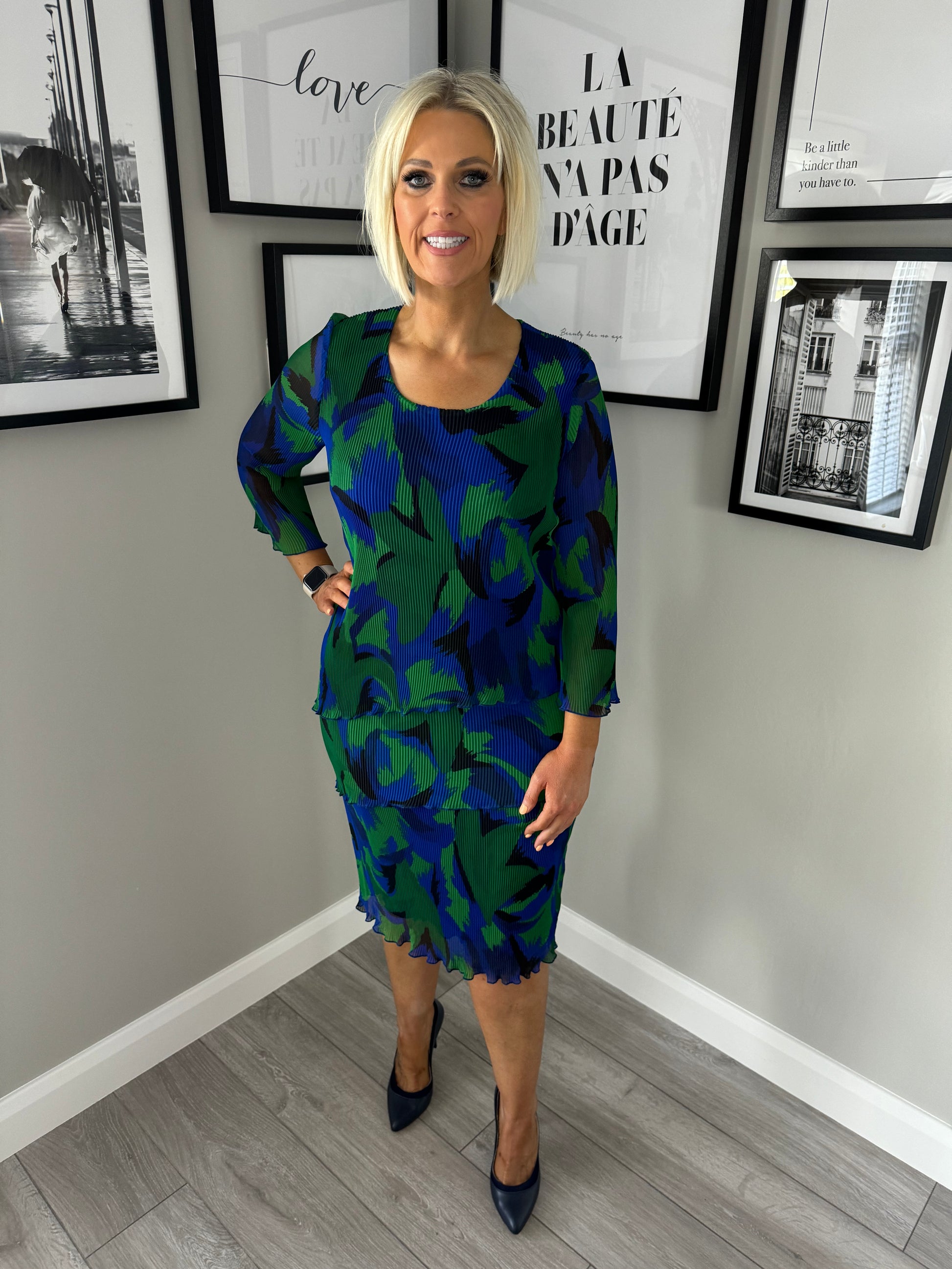-Glitz royal & green printed dress with three quarter length sleeves, round neck & tiered layered look