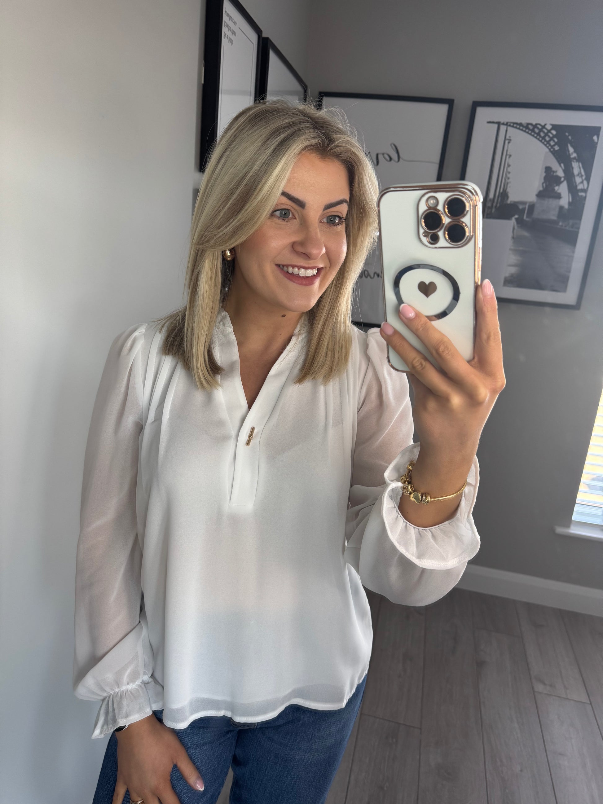-Kate & Pippa chiffon long sleeve blouse in white with grandad style V neck collar & gold bar fastening.
