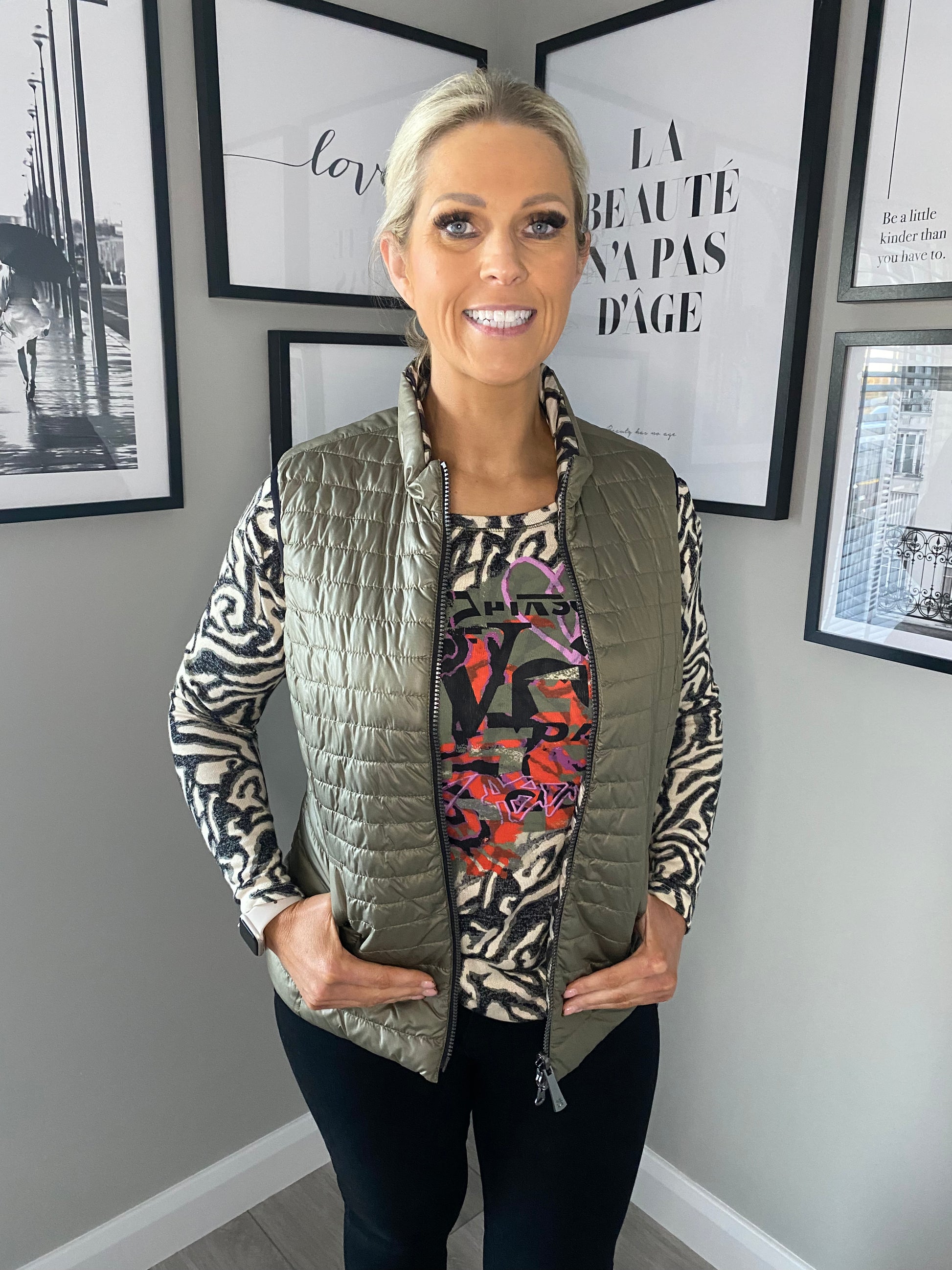 From the Barbara Lebek there's nothing quite like two gilets in one! On one side a perfect mid khak, which then reverses to a striking cream/khaki/charcoal mix print. We styled with the matching jumper (in the same print).
