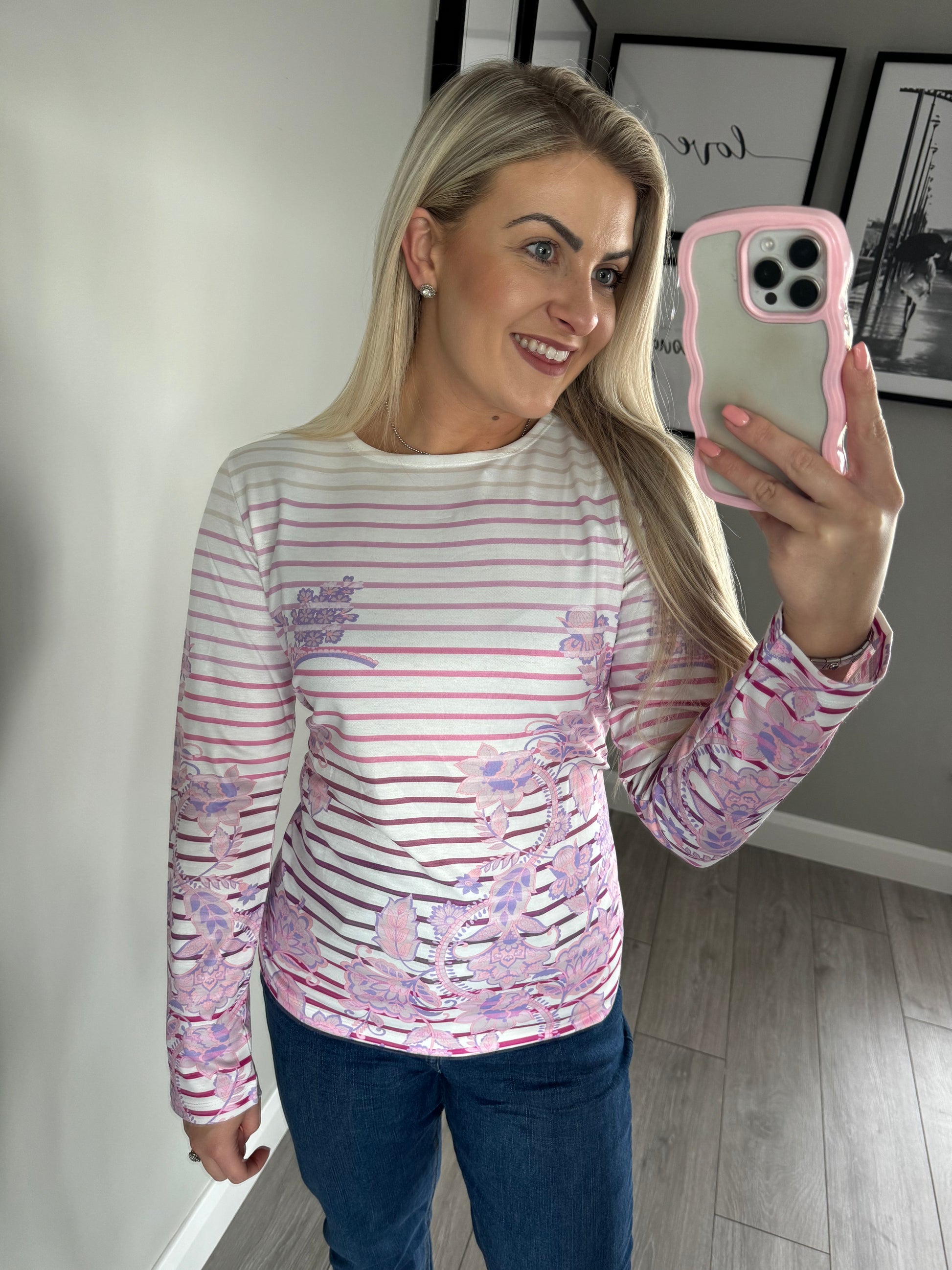 -Jessica Graff aqua blue/denim and white striped/floral long sleeve tee with pocket design