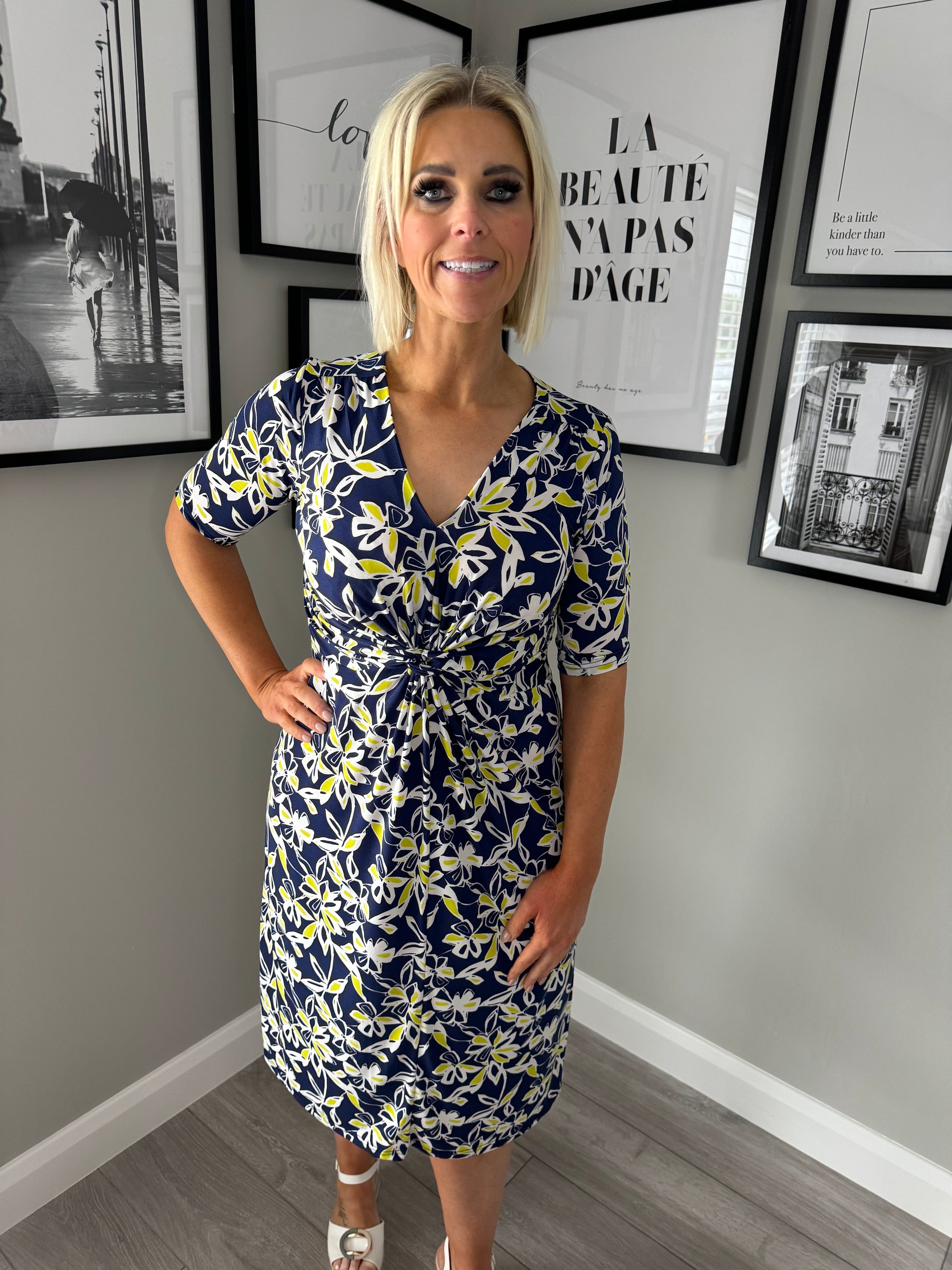 From the Lily & Ruby range this is the most flattering style! With knotted detail to the stomach it's forgiving for every body shape! With a navy base it's printed throughout in an abstract floral white & lime print & finished with a half sleeve.