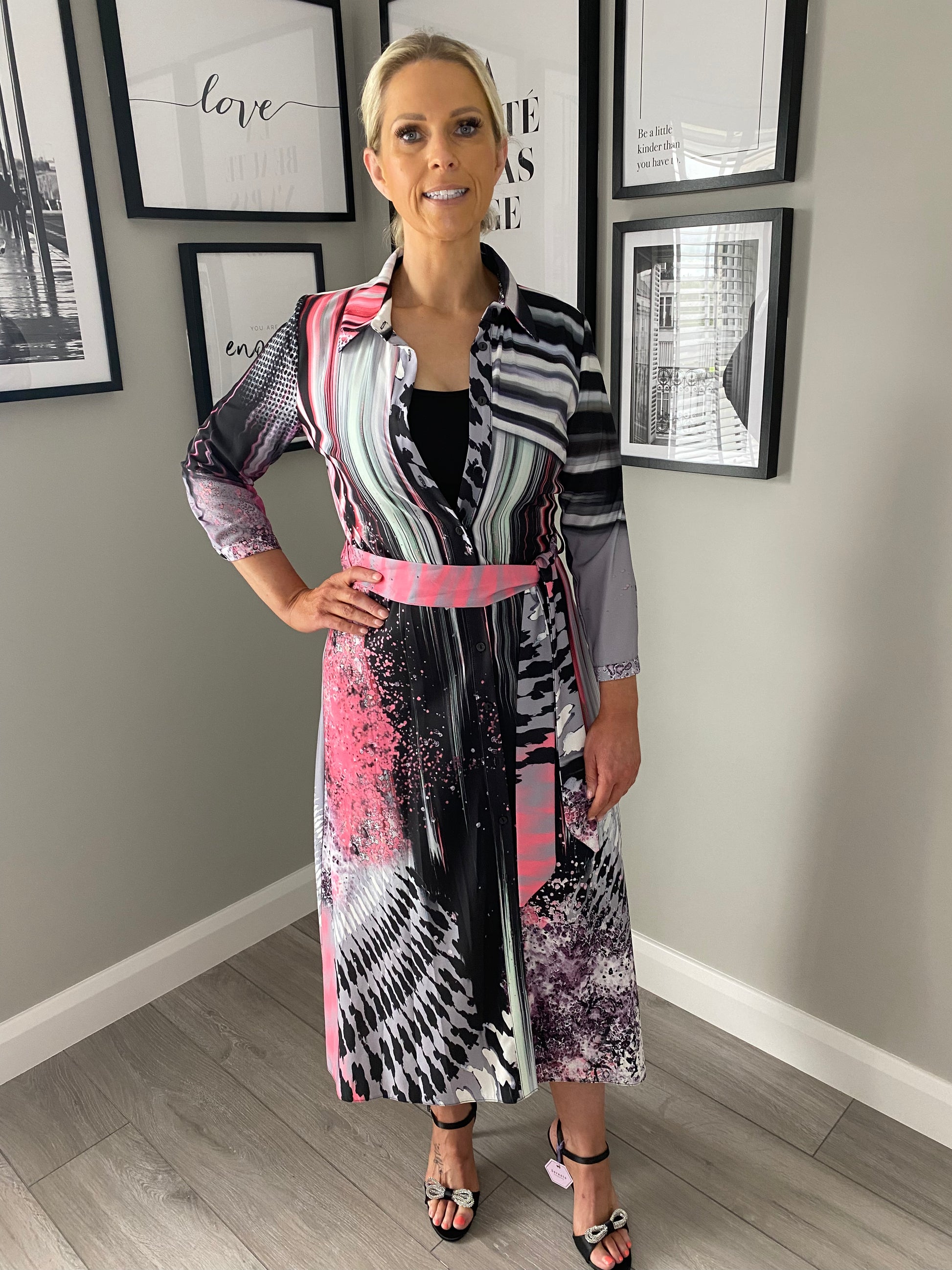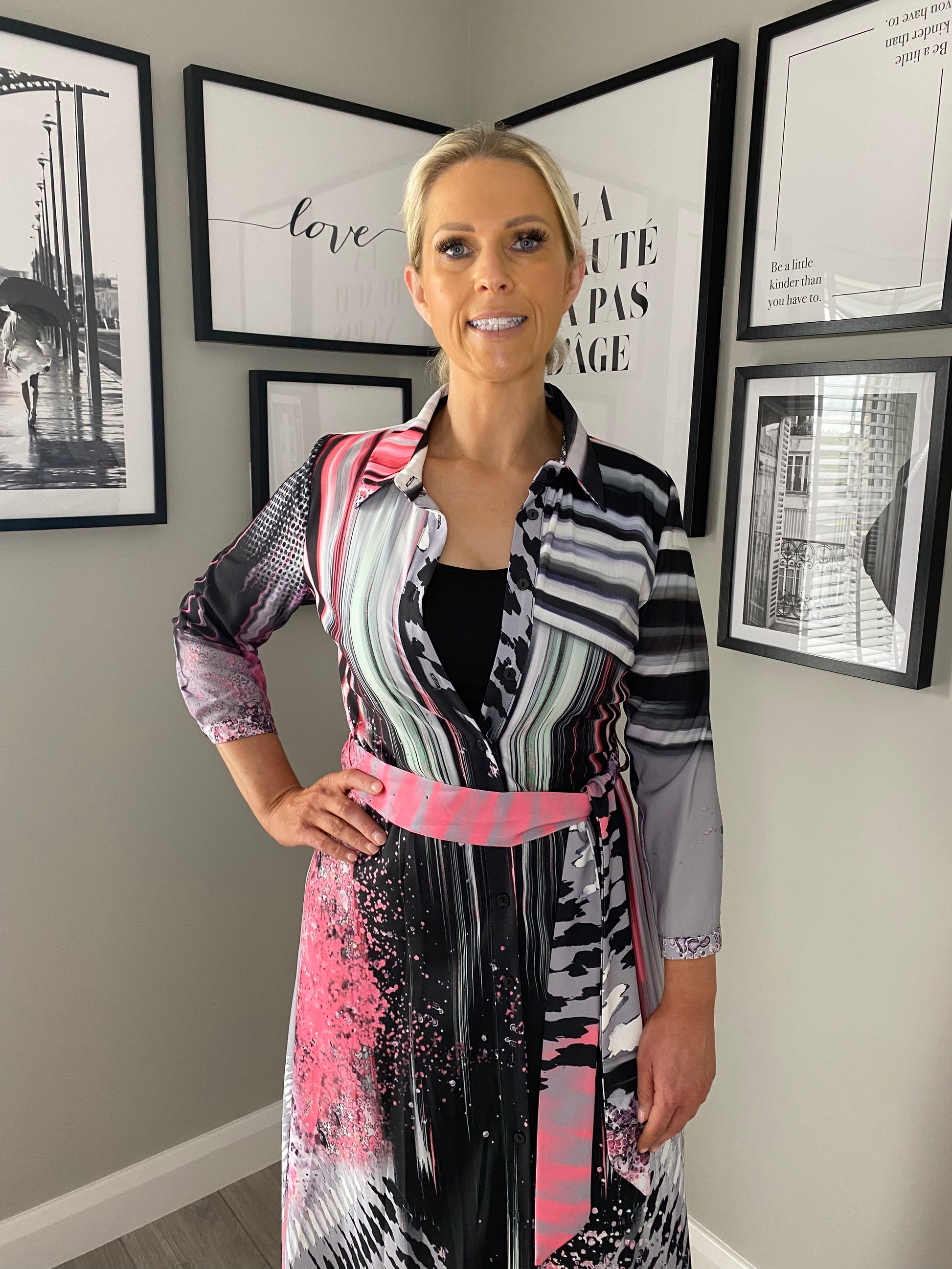 From the Lizabella range this shirt style dress is all about colour. With black/grey being the main colour its then popped with pink & mint green in a multi print. It's got a typical shirt style collared neckline, three quarter length sleeves & matching waisting belt. It's layered with a black matching vest (dress length) for further shirt effect.