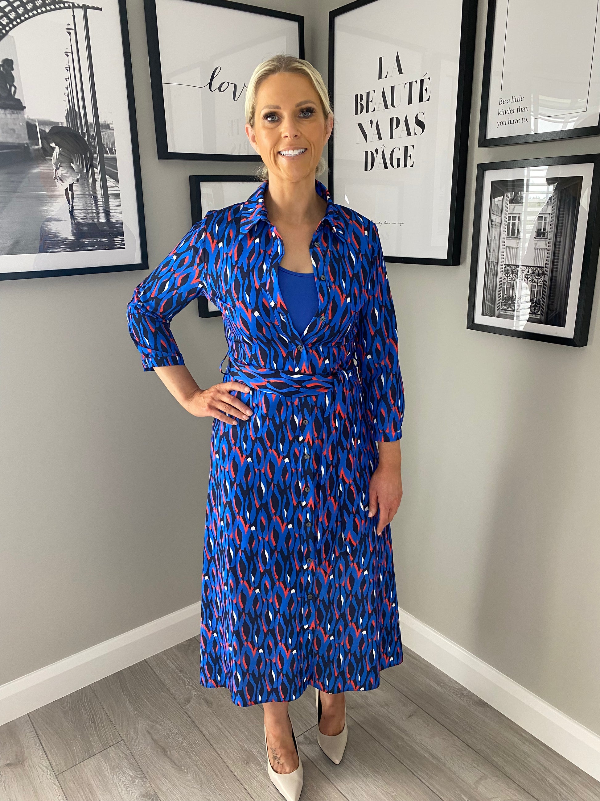From the Lizabella range we've got a royal blue shirt style dress. On a royal base with red, black & white print throughout its got a typical shirt style collared neckline, three quarter length sleeves & matching waisting belt. It's layered with a royal blue matching vest (dress length) for further shirt effect.
