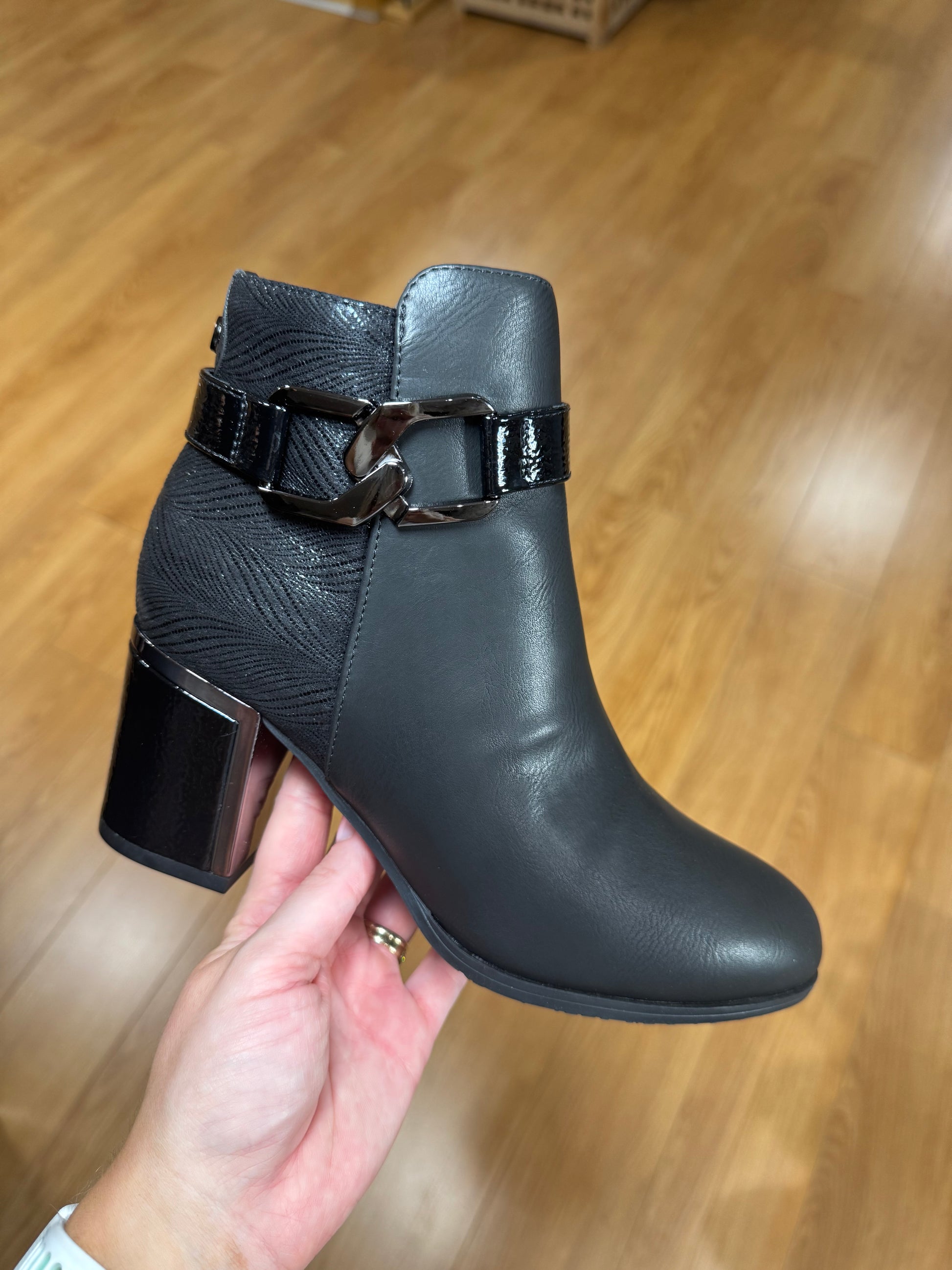 Lotus Block Heeled Boot with Subtle Printed Back, Patent Strap & Gunmetal Buckle