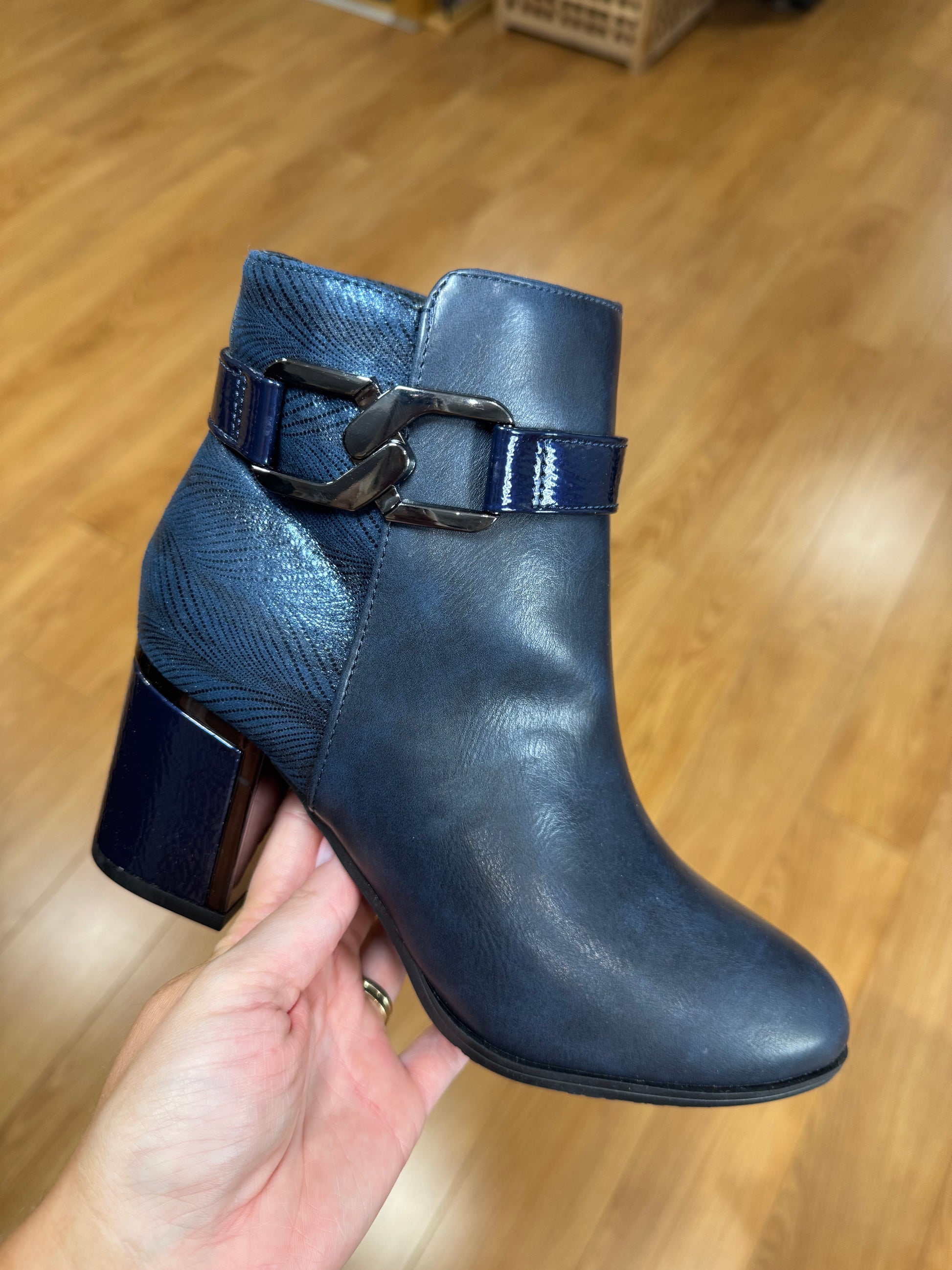 Lotus Block Heeled Boot with Subtle Printed Back, Patent Strap & Gunmetal Buckle