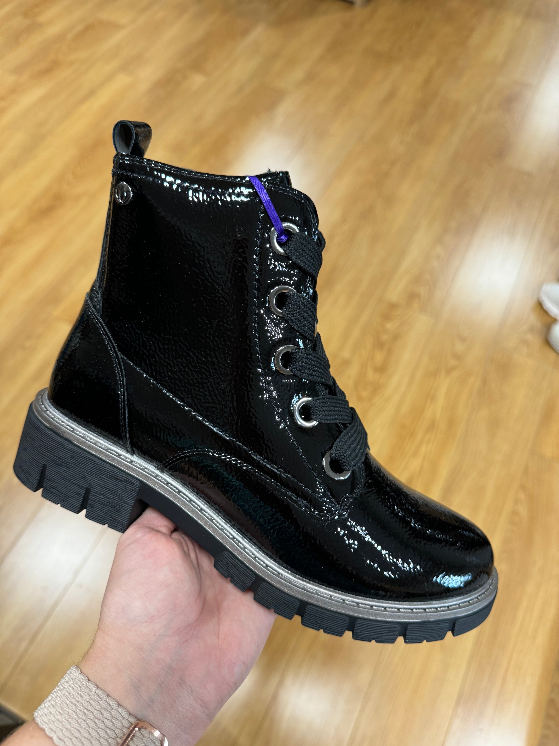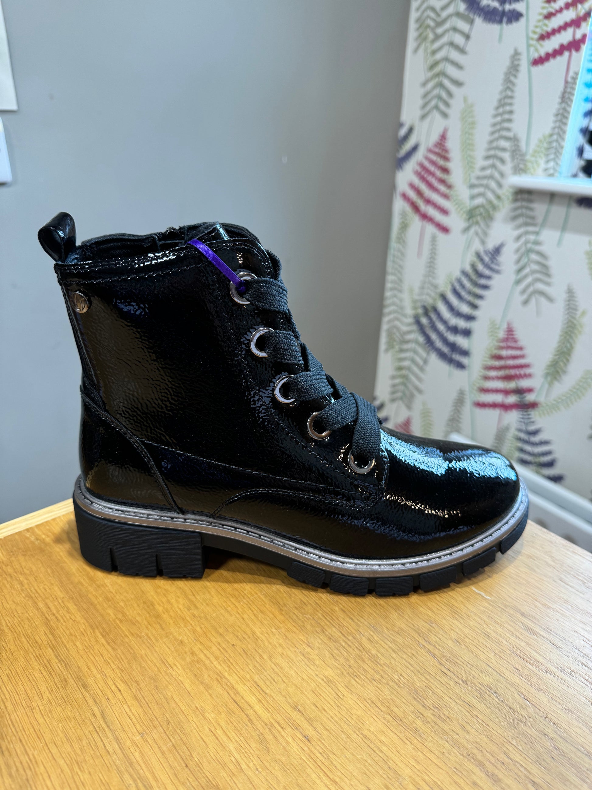 Lotus Biker Style Lace Up Boots in Patent Finish (Inside Zip Opening)