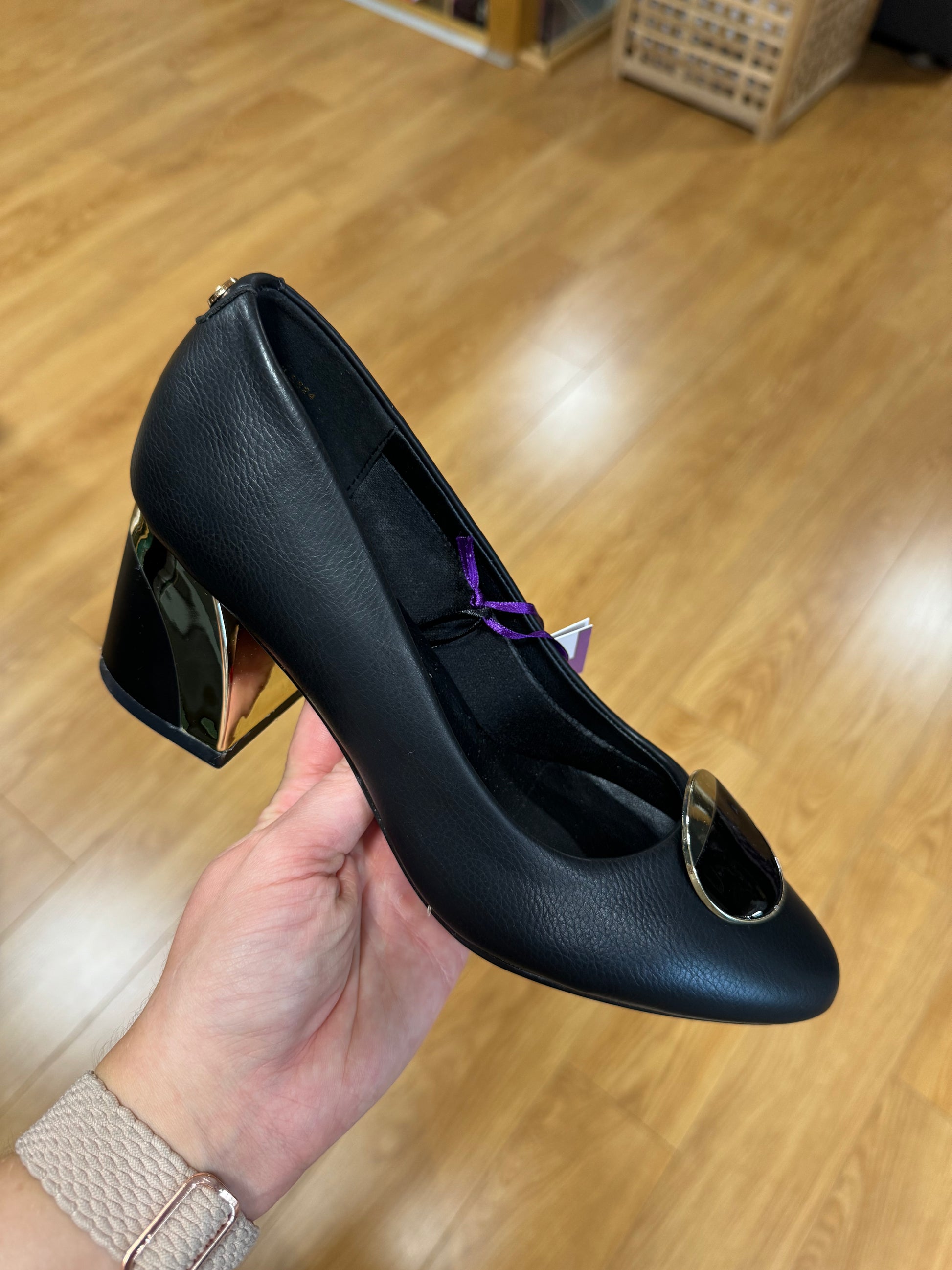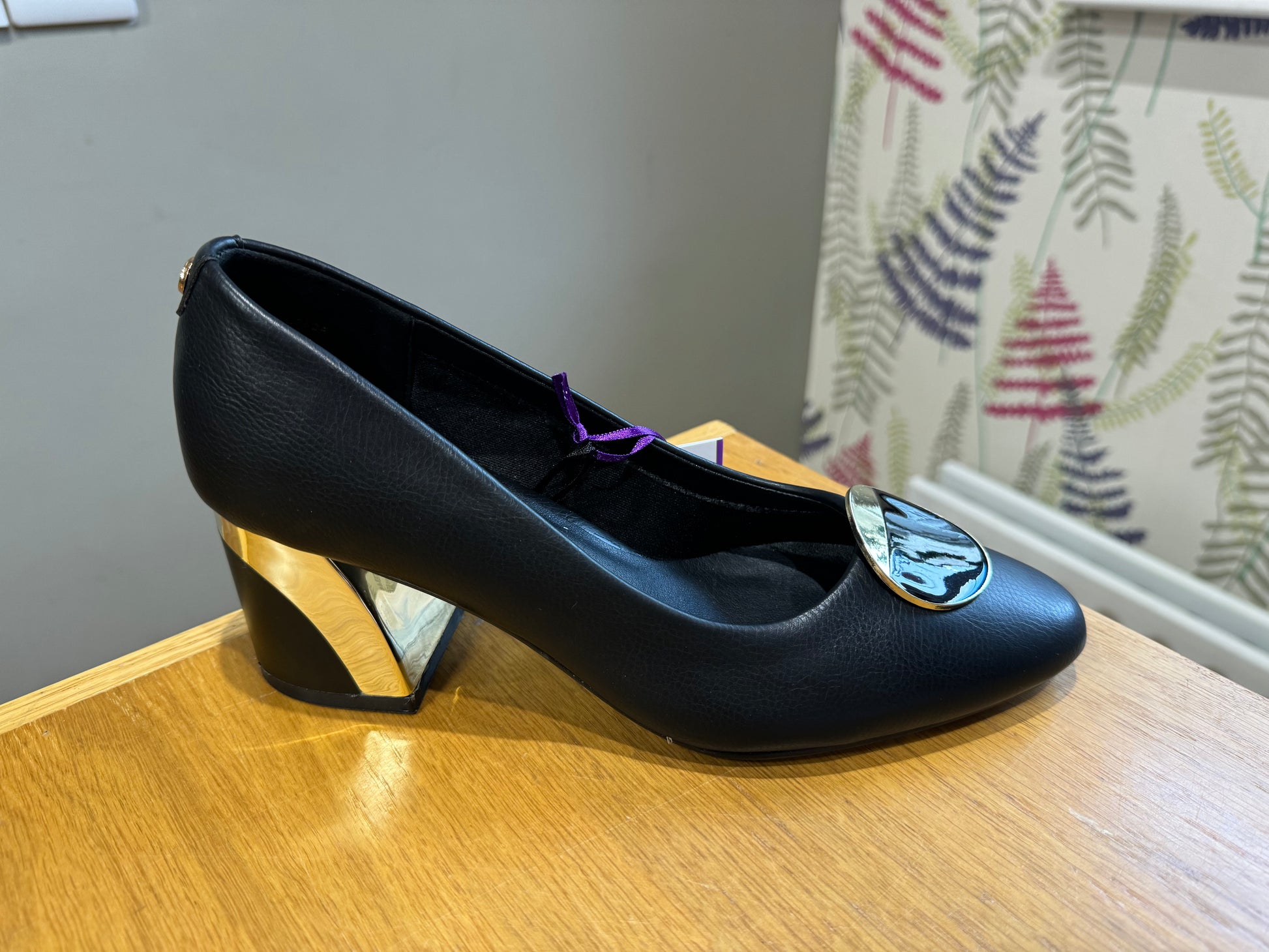 Lotus Block Heeled Shoe in Leather Finish with Gold Hardware Toe Detail