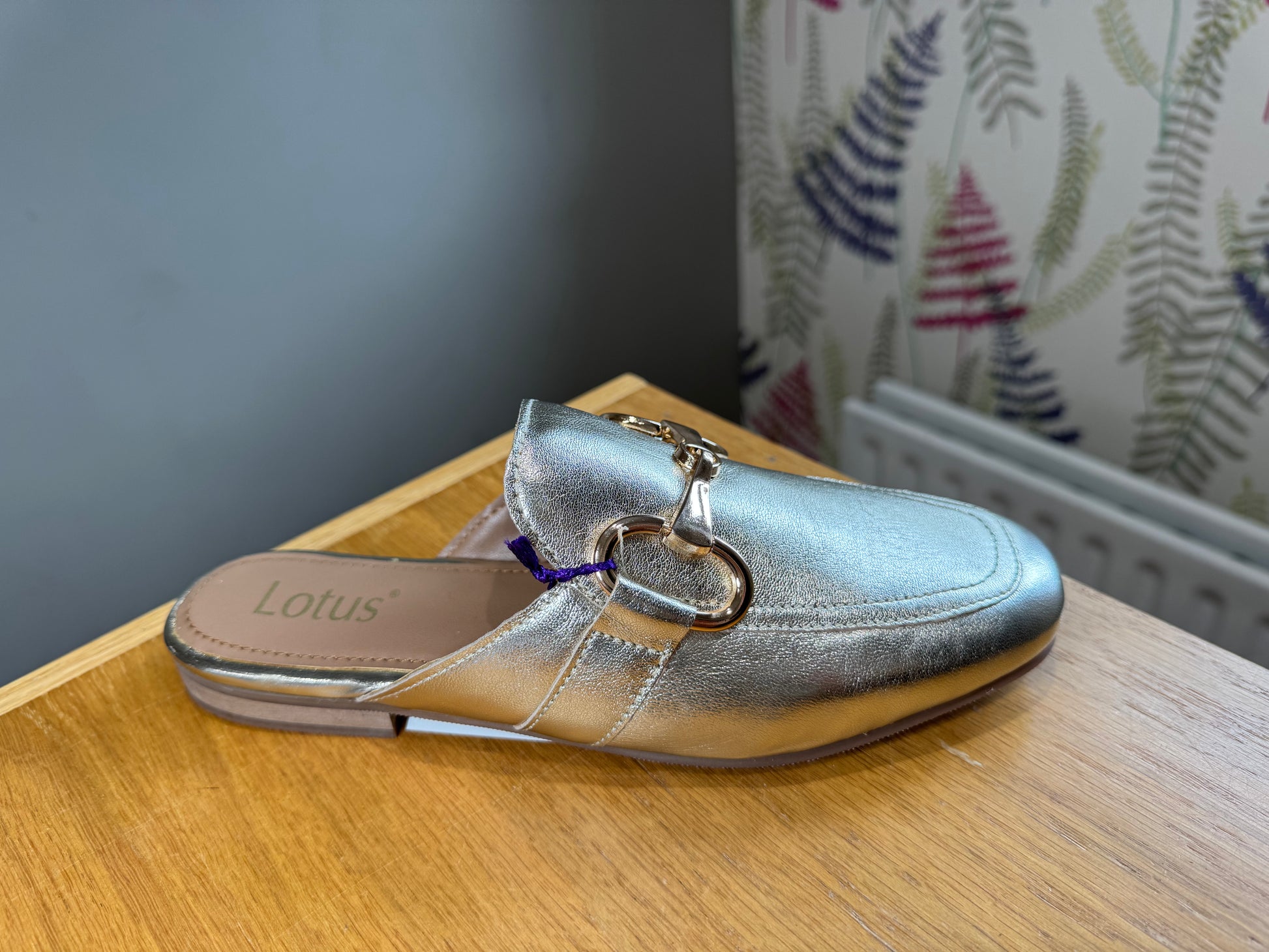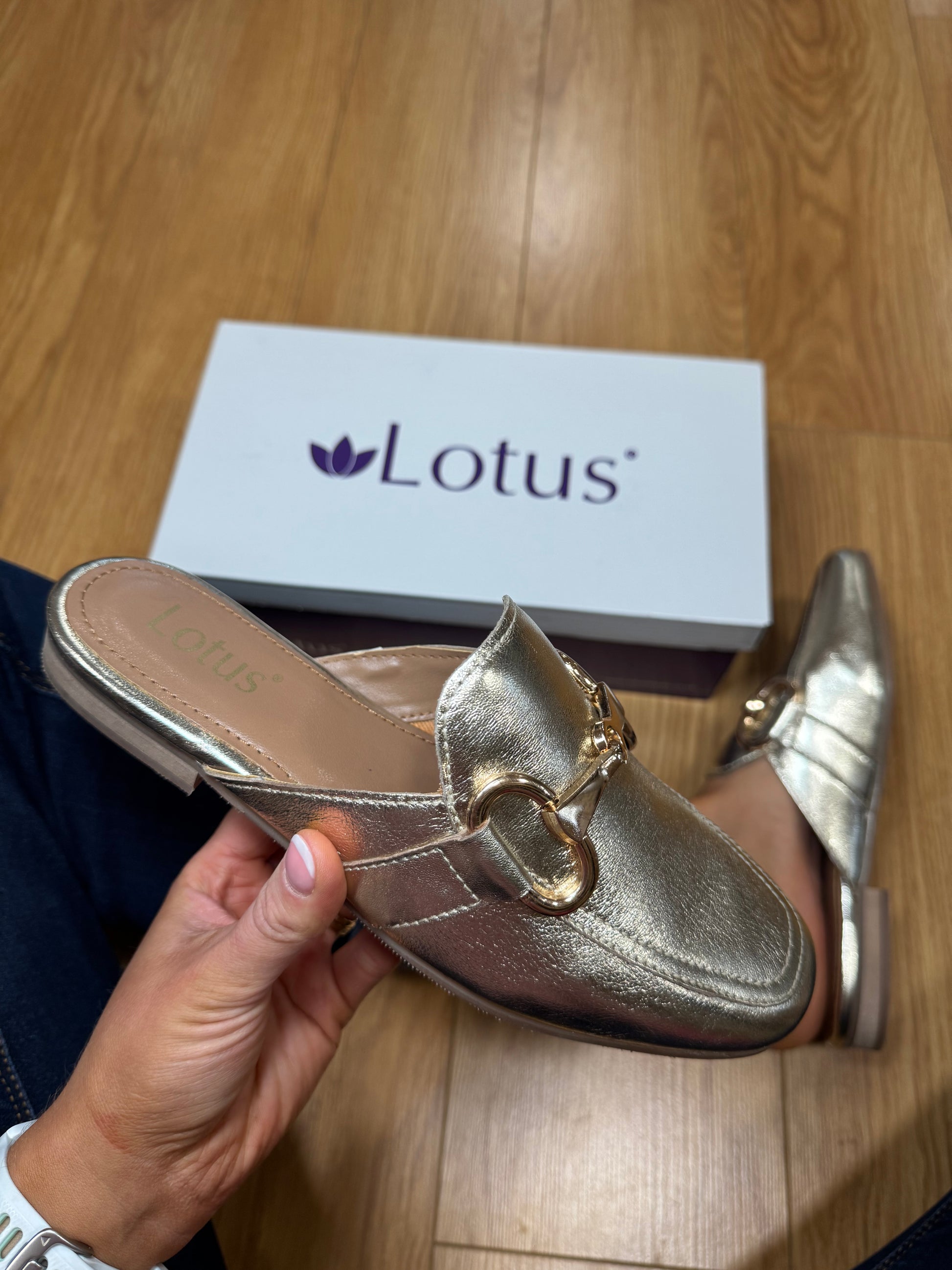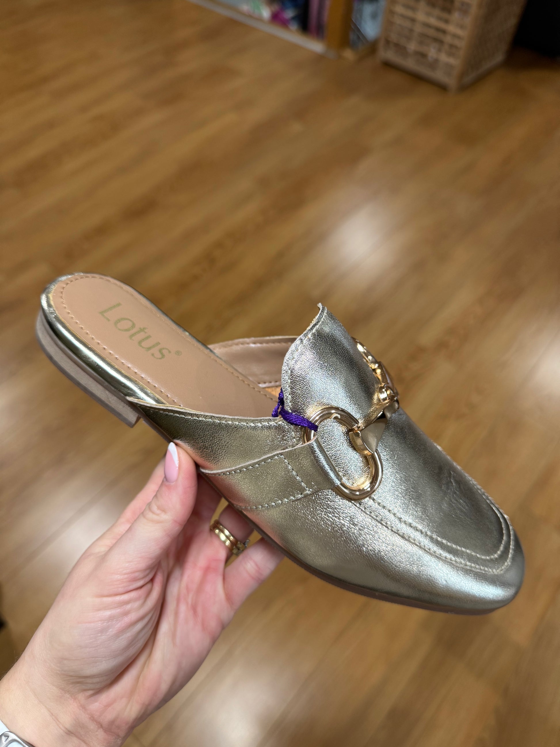 Lotus Soft Leather Flat Slip On Loafer in Metallic Finish with Gold Snaffle Buckle