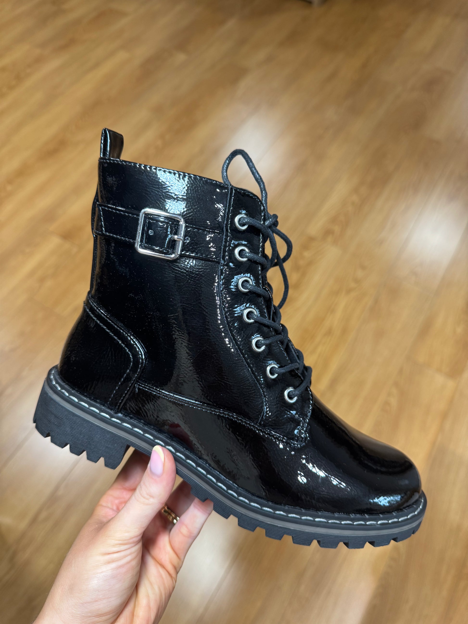 Lunar Lace Up Boot (Inside Zip Opening) in Patent Finish with Buckle/Silver Hardware