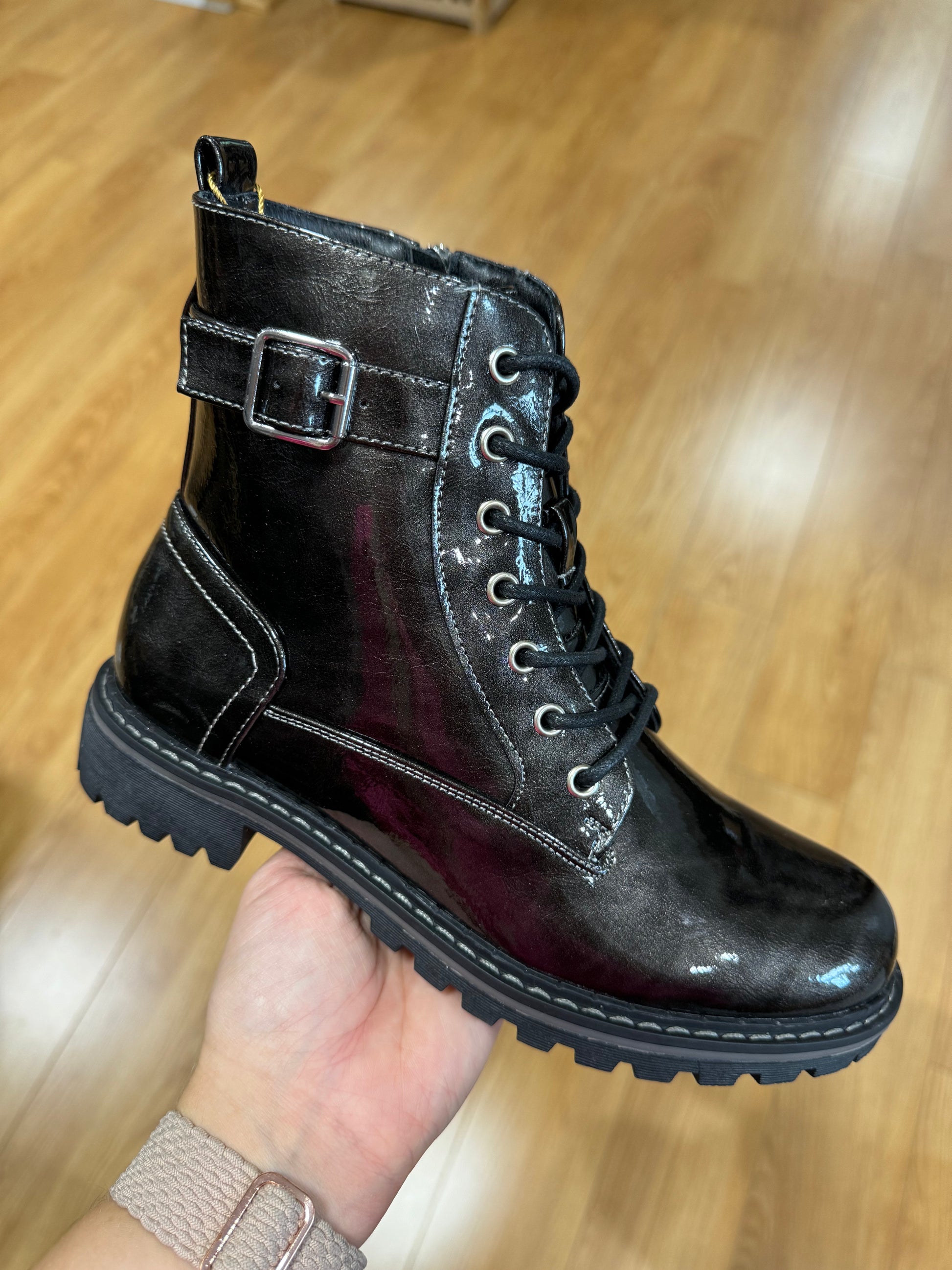Lunar Lace Up Biker Style Boot (Inside Zip Opening) in Patent Finish & Buckle Detail