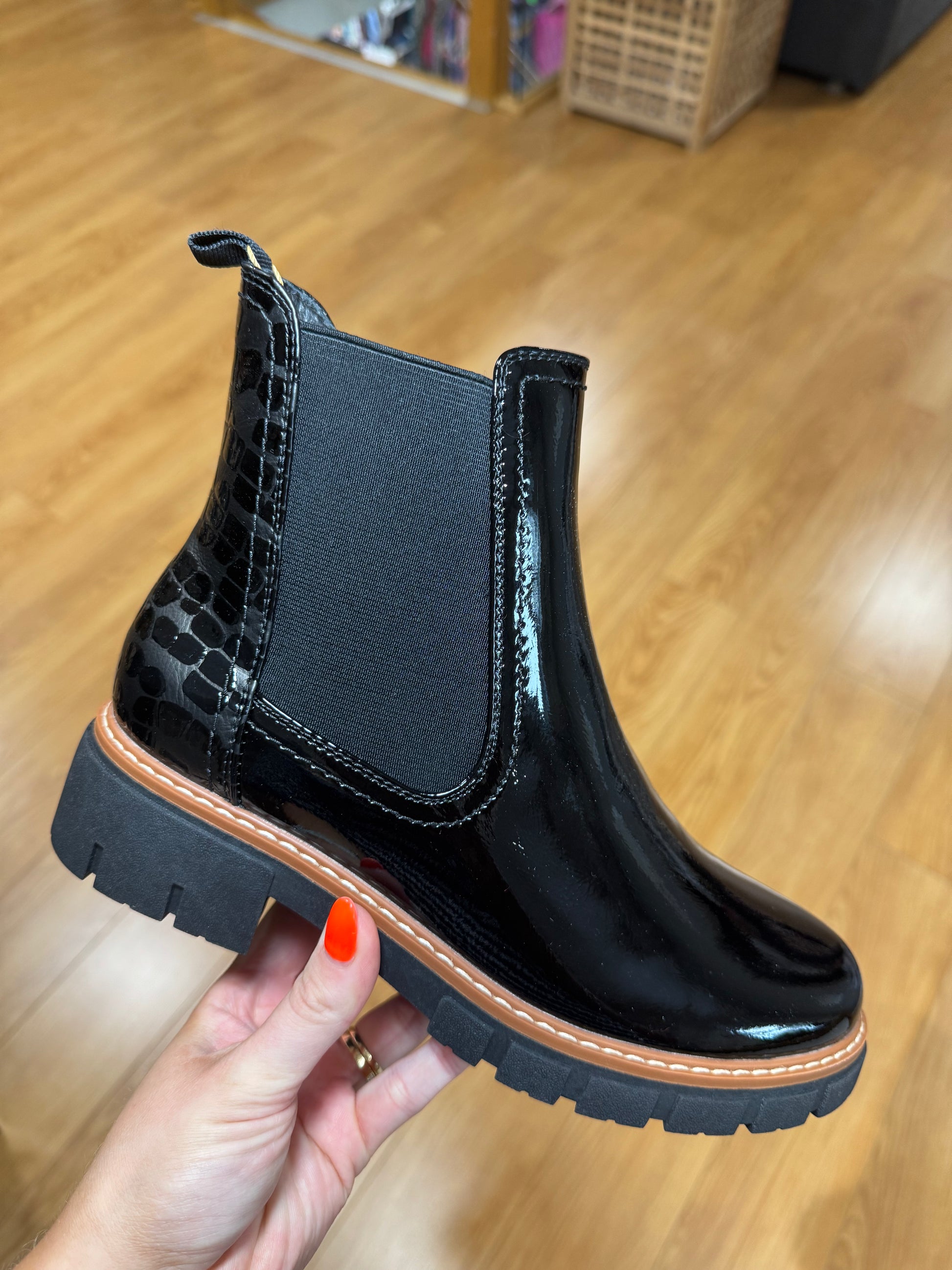 Lunar Flat Slip On Chelsea Style Boot in Patent Finish with Subtle Printed Heel