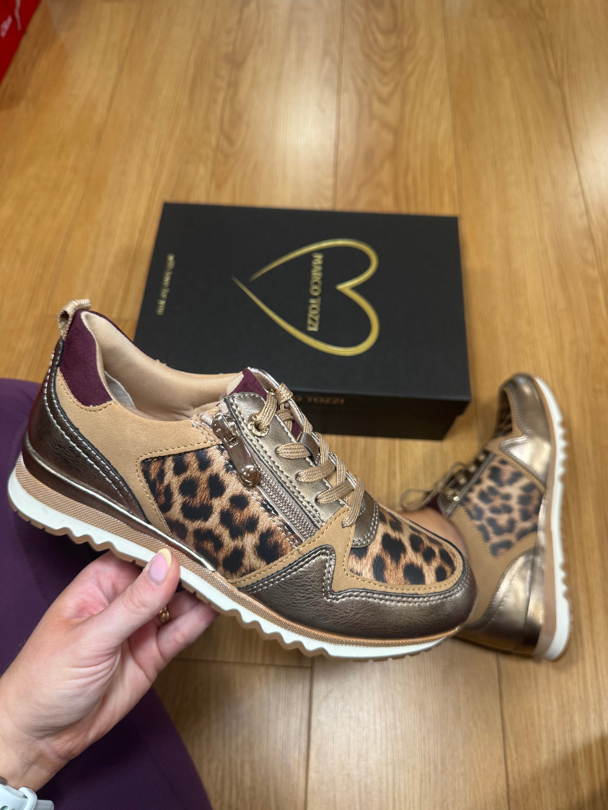 Marco Tozzi Lace Up Trainer (Zip Opening) in Leopard Print Design with Contrasting Metallic/Heel Design