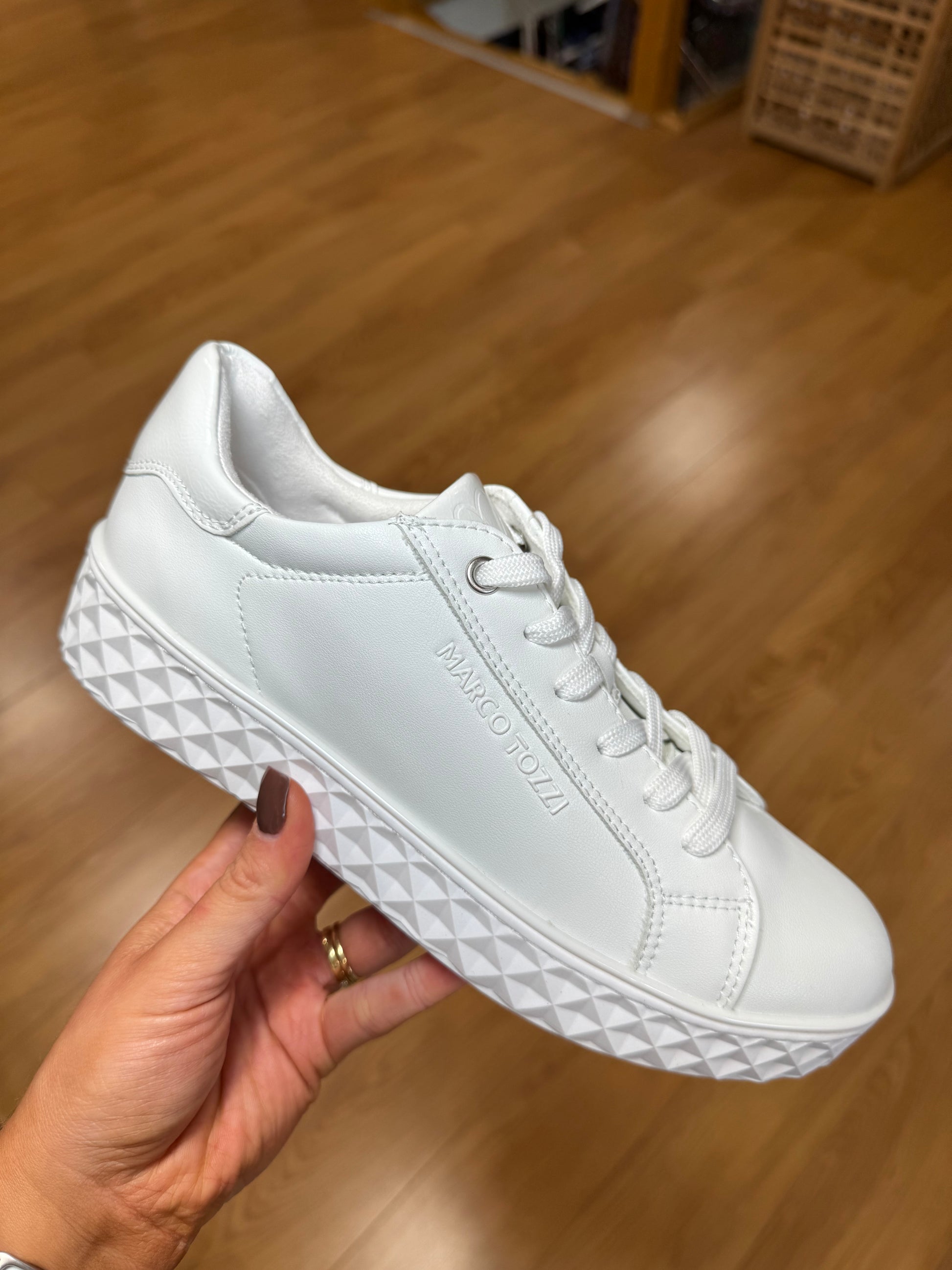 Marco Tozzi Lace Up Trainer in Solid White with Geometric Style Sole