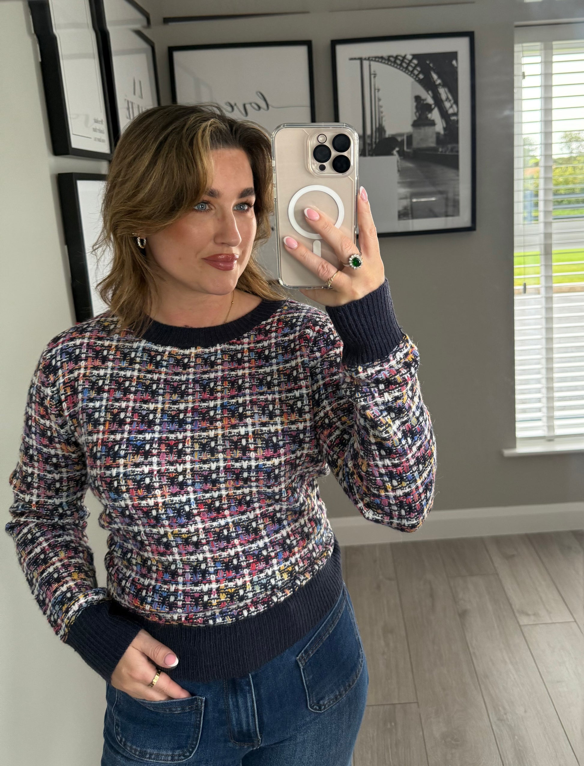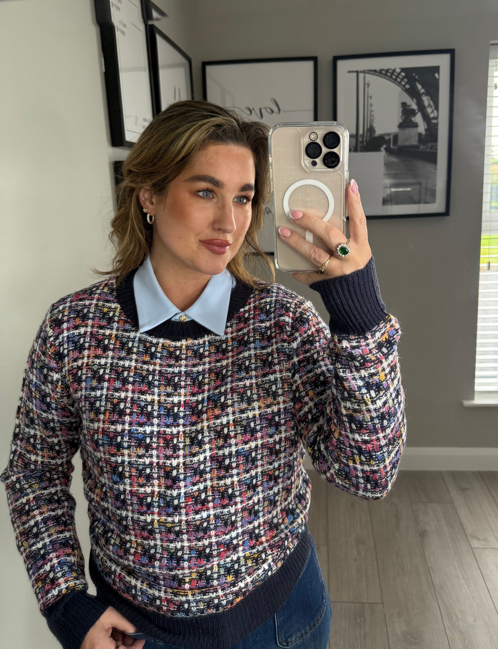 -Claudia C. navy/multi coloured knit jumper with round neckline & cuffed sleeves. Optional blue collar pictured is our Yest blue shirt.