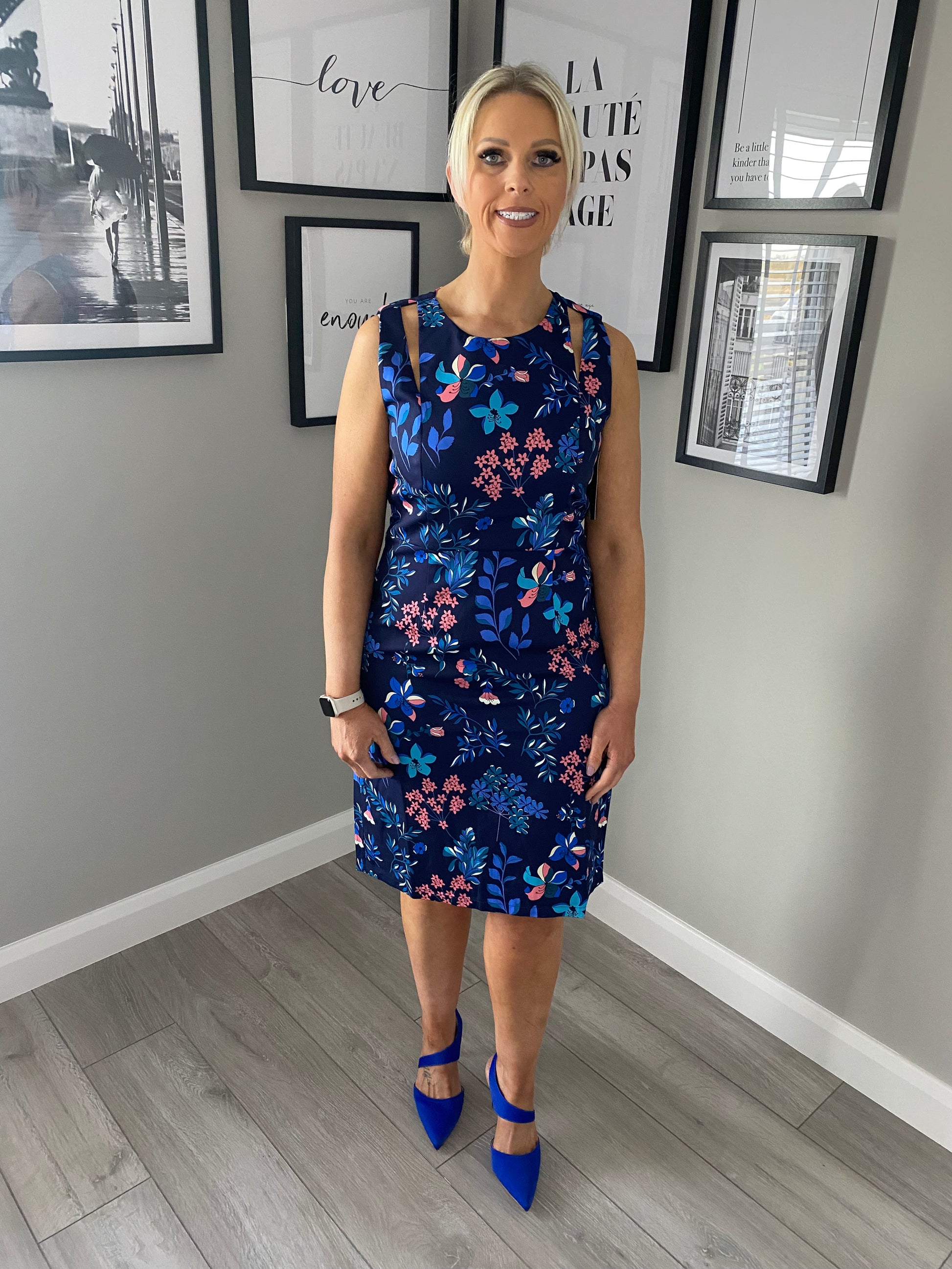 On a navy base this dress is printed with royal & soft print flowers giving it that Summery feel. It sits just on/below the knee & is finished beautifully with double slit opening between the neckline & sleeve ending. We styled with our Sorento royal blue shoes to pull out the blues.