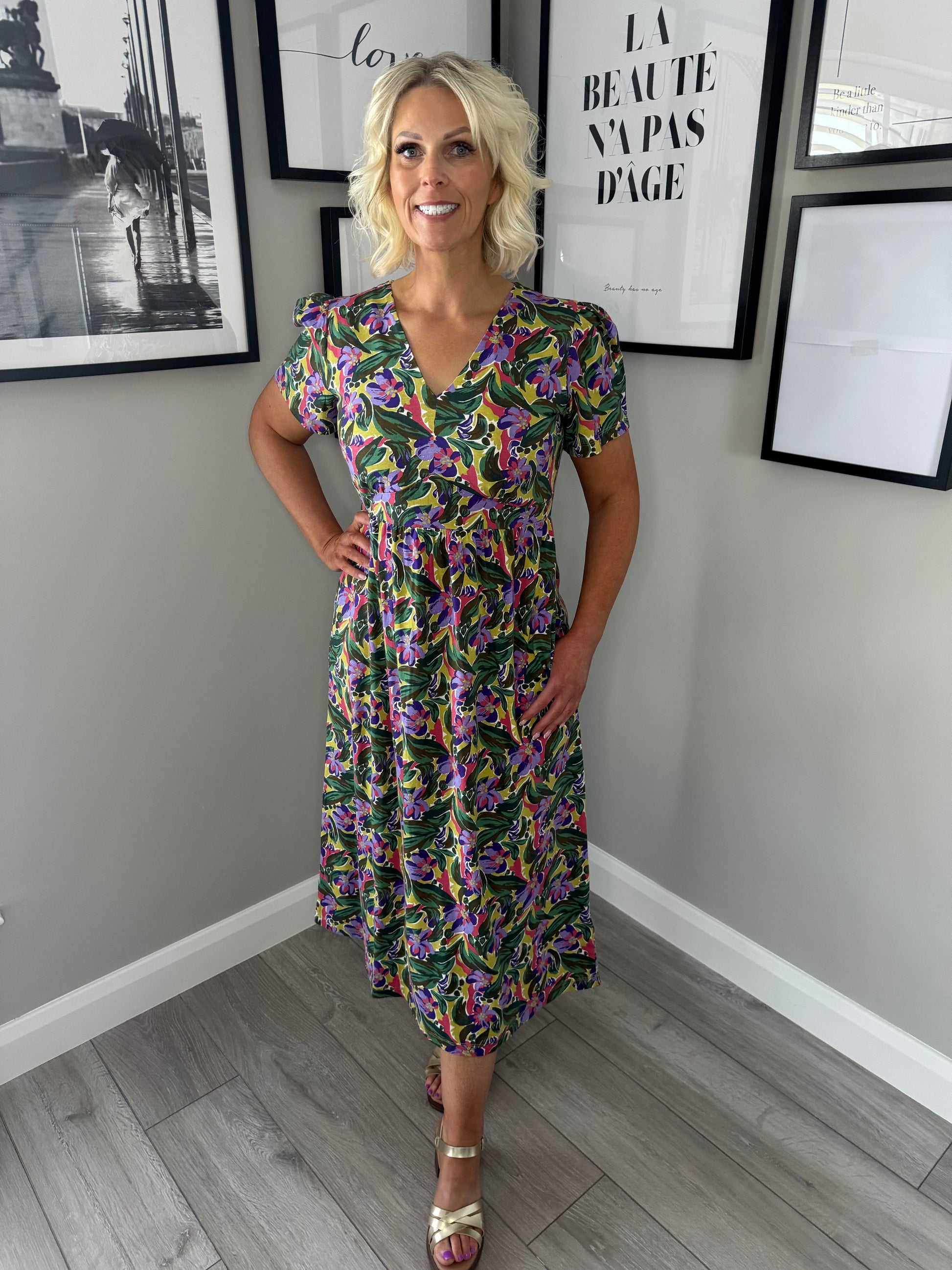 -Nomads multi coloured floral print dress with short sleeves, V neckline & lightly flared skirt.