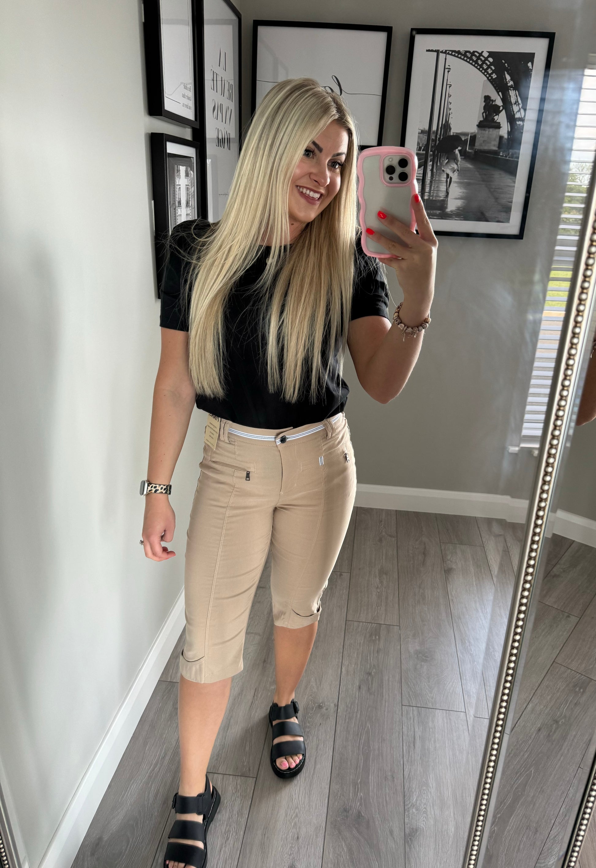 From our best selling Pinns range we have the crops in pedal pusher length (just below the knee). In deep beige with two toned striped effect belt built in, double pocket front & buttoned hem these Pinns don't lack detail!