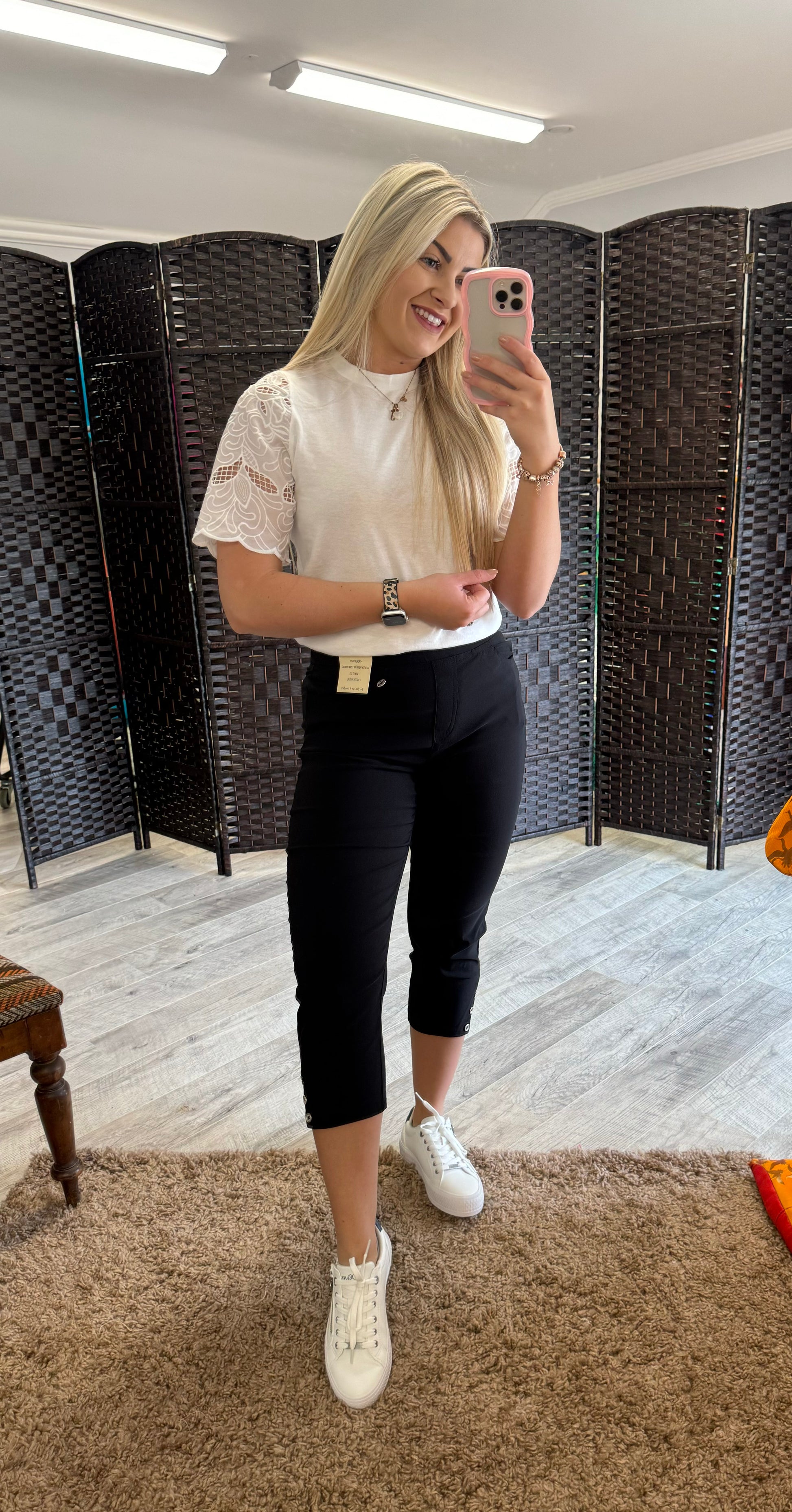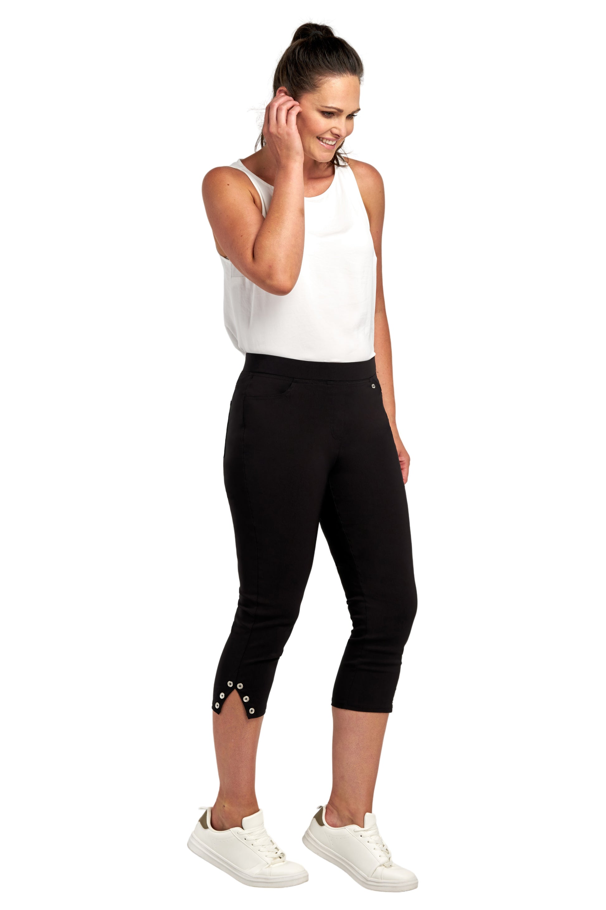 Pinns bengaline crop with calf button & split hem detail, full elasticated pull up waist with slim leg fit, stretch fabric for extra comfort. Leg length 56cm
