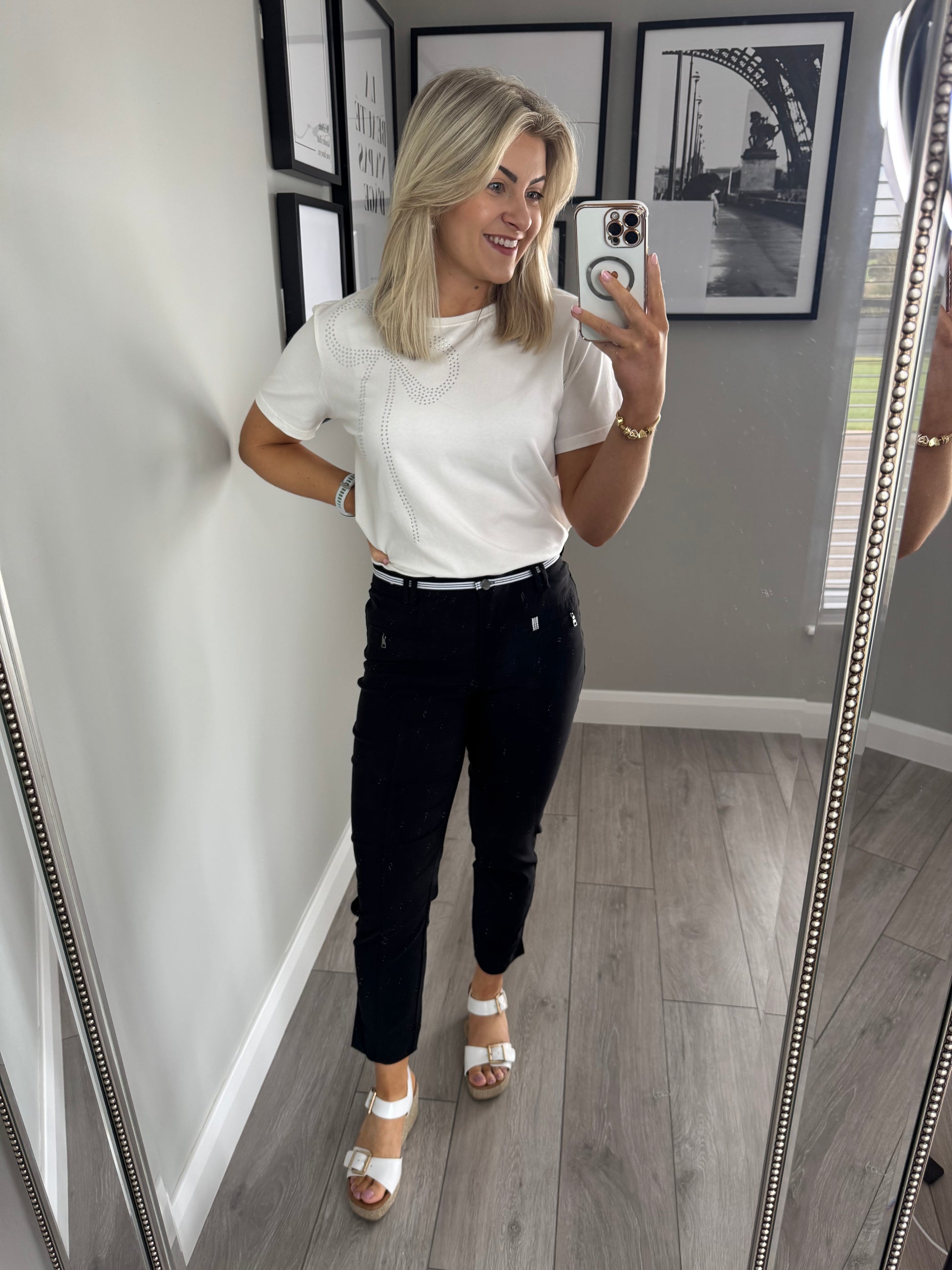 -Pinns bengaline stretch 7/8 cropped trousers in black. Small split to outside of hemline & stripe detail to waist. Button & zip fastening.