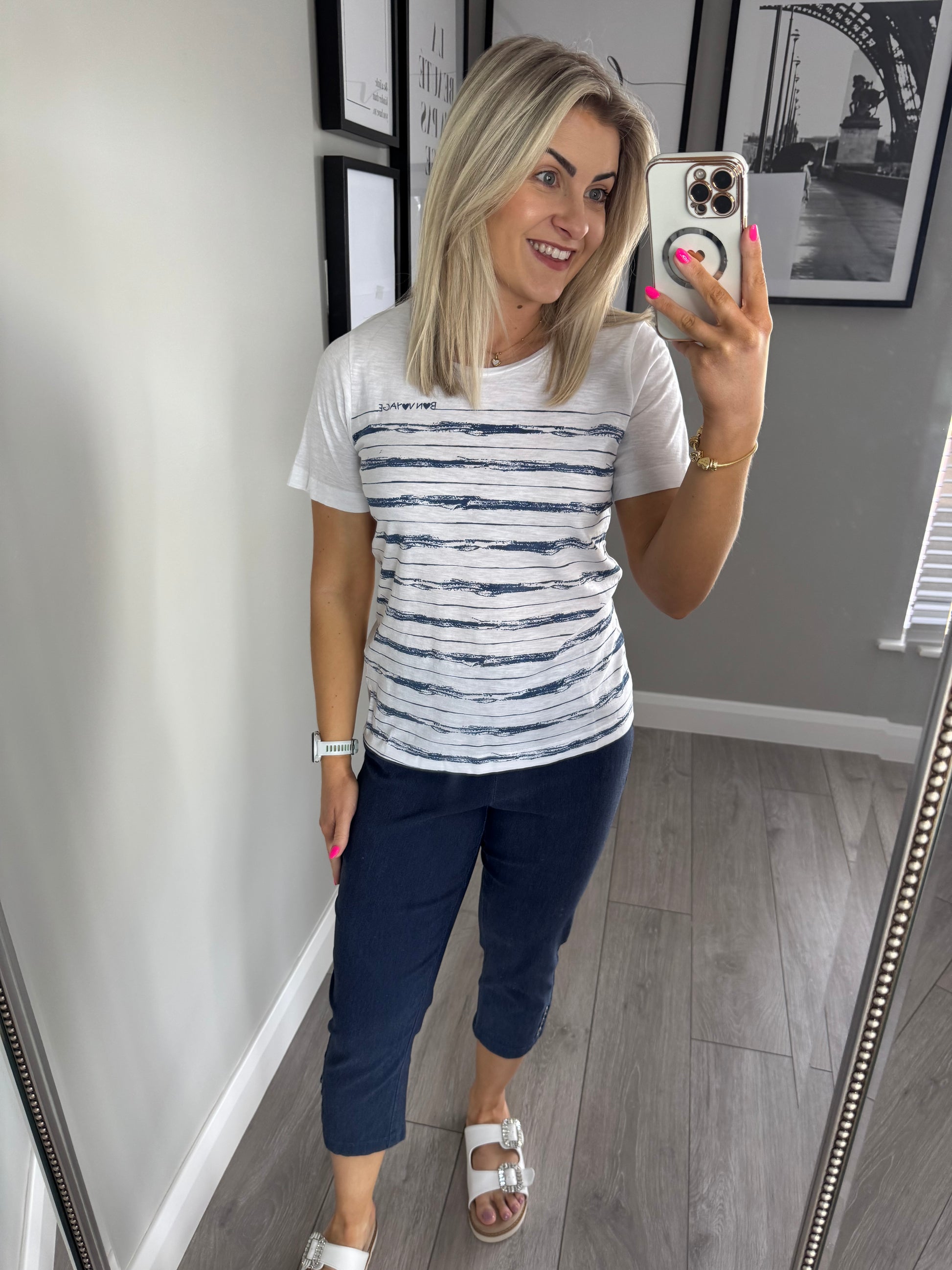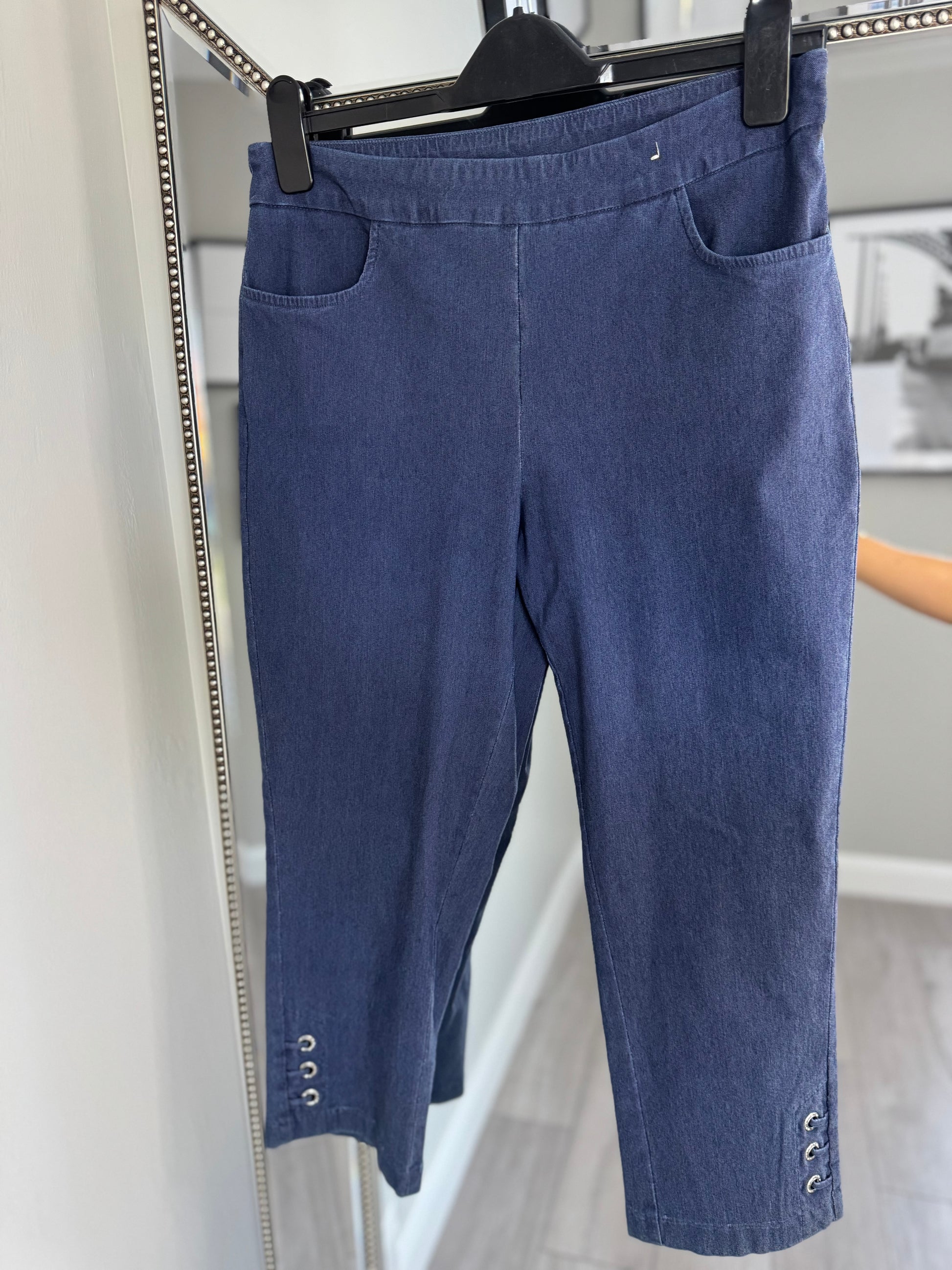 From our best selling Pinns range we have the crops in three quarter length. This is one of our best selling styles as it's a complete pull on (no buttons or zips to do!) With thick elasticated waist band (sculpting tummy tuck), double pockets & triple diamanté detail below the knee its no surprise its a best seller.