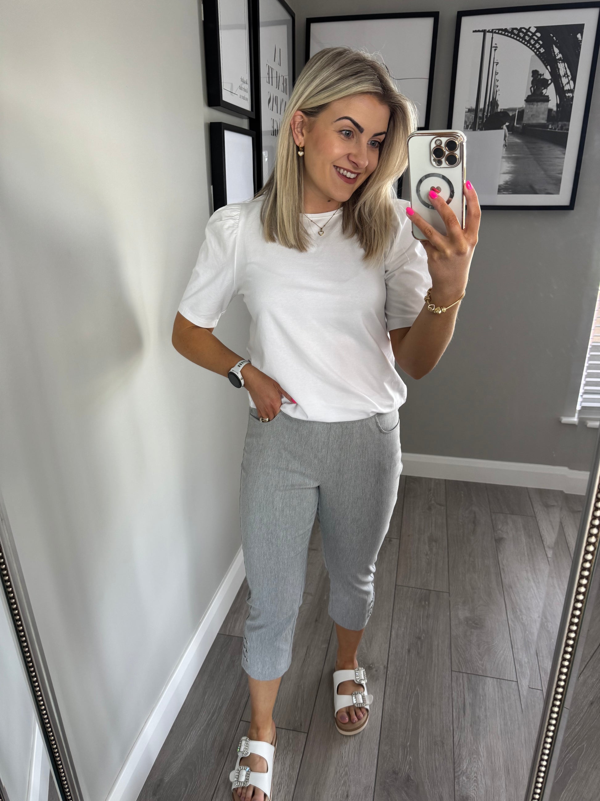 From our best selling Pinns range we have the crops in three quarter length. This is one of our best selling styles as it's a complete pull on (no buttons or zips to do!) With thick elasticated waist band (sculpting tummy tuck), double pockets & triple diamanté detail below the knee its no surprise its a best seller.