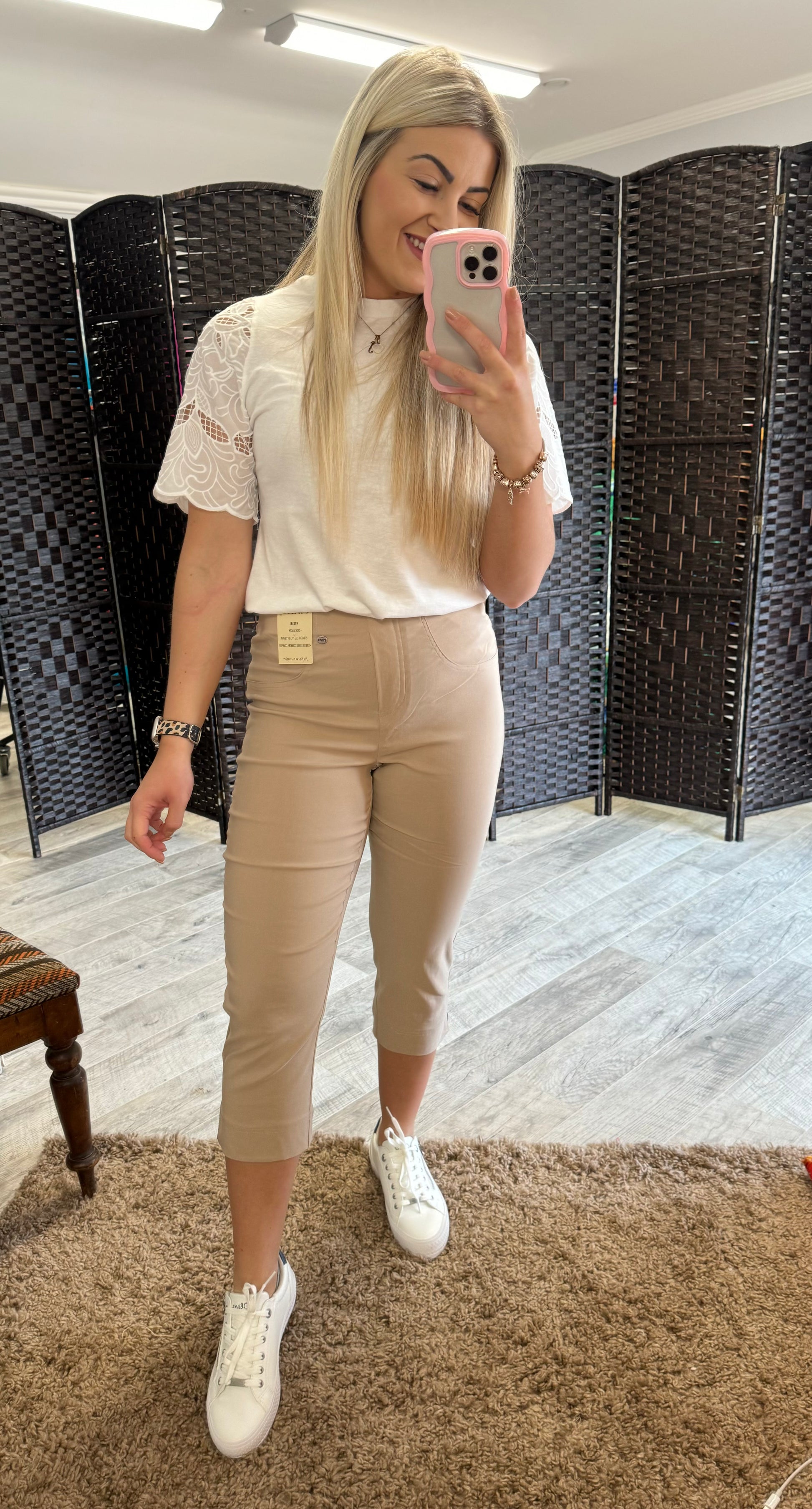 Figure Sculpting Bengaline Crop Trousers.  Flattering slim fit three-quarter length trouser, with elasticated waist and tummy control. Super stretchy fit to provide all-day comfort.