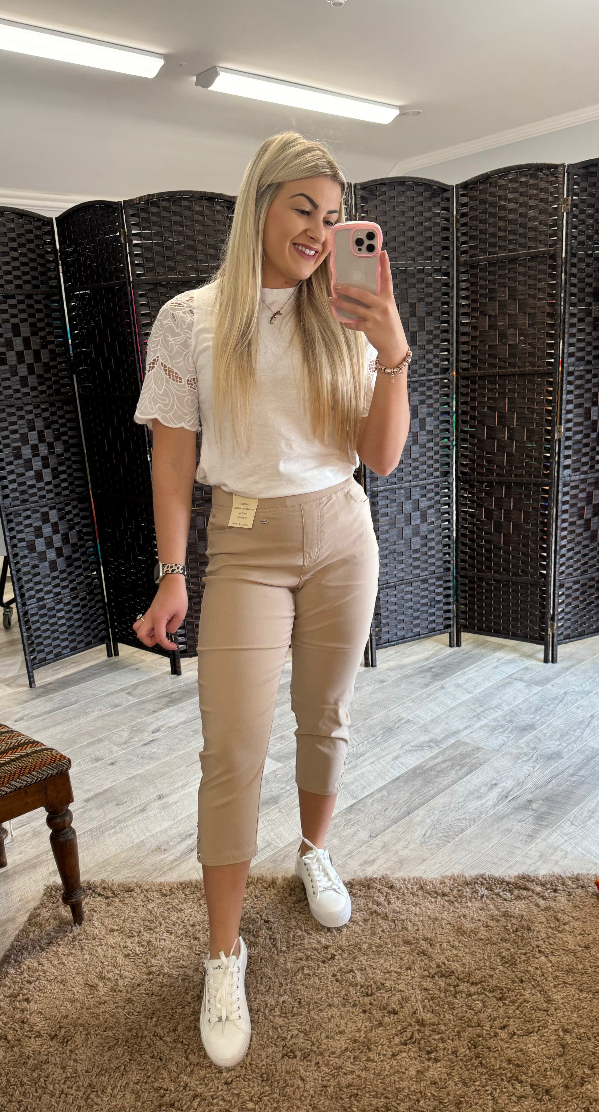 Pinns bengaline crop with calf button & split hem detail, full elasticated pull up waist with slim leg fit, stretch fabric for extra comfort. Leg length 56cm