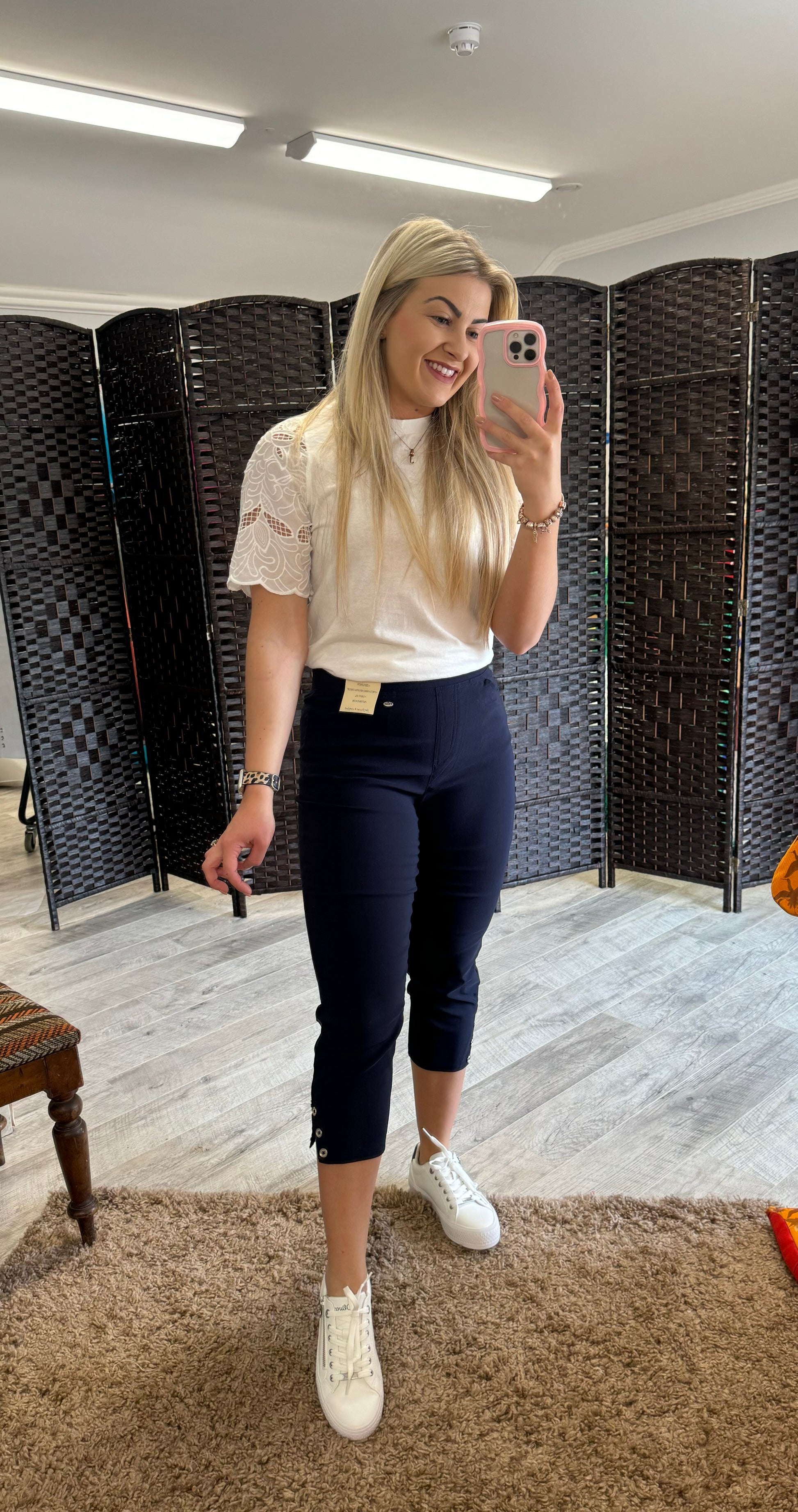 Pinns bengaline crop with calf button & split hem detail, full elasticated pull up waist with slim leg fit, stretch fabric for extra comfort. Leg length 56cm