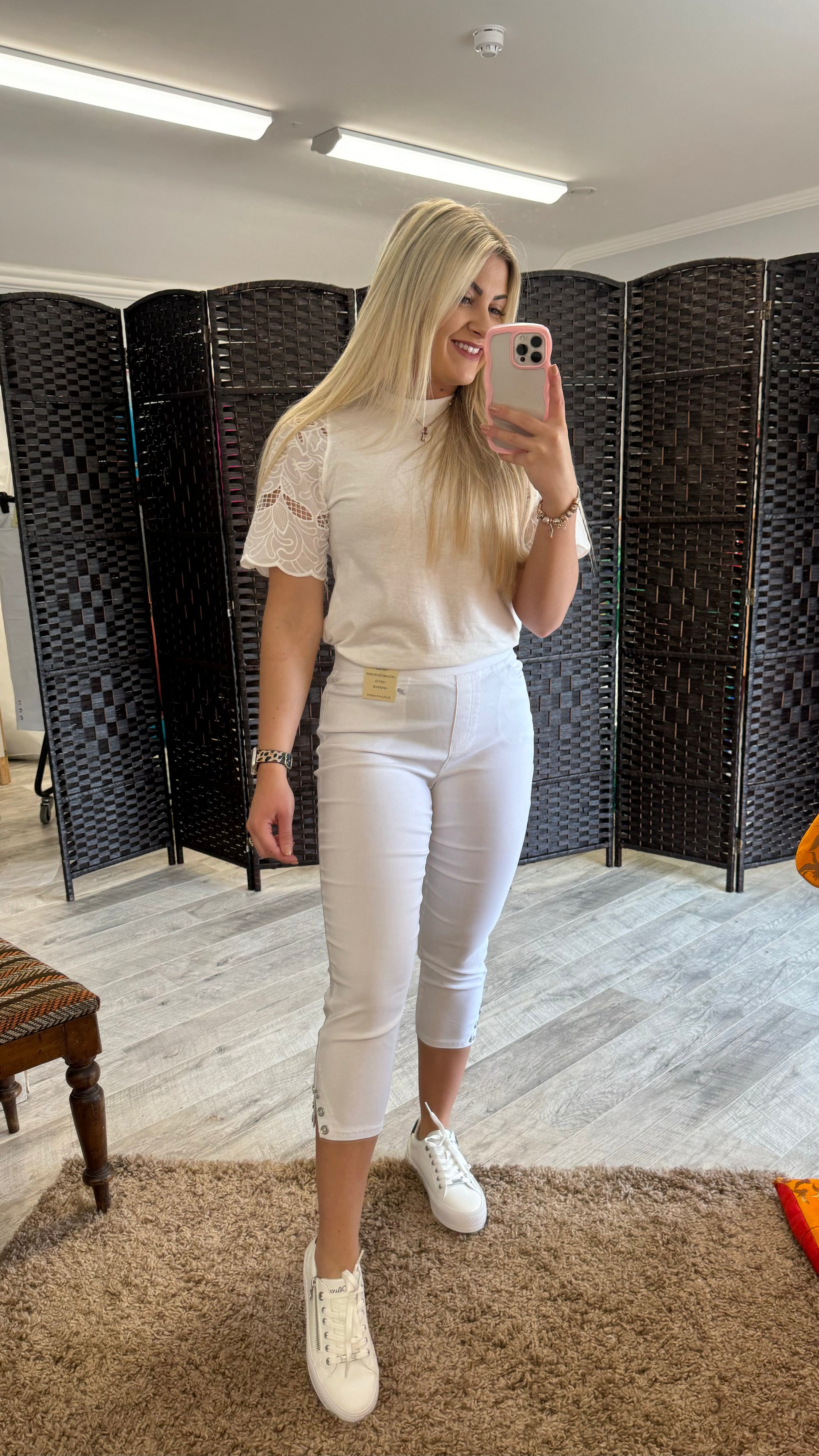 Pinns bengaline crop with calf button & split hem detail, full elasticated pull up waist with slim leg fit, stretch fabric for extra comfort. Leg length 56cm