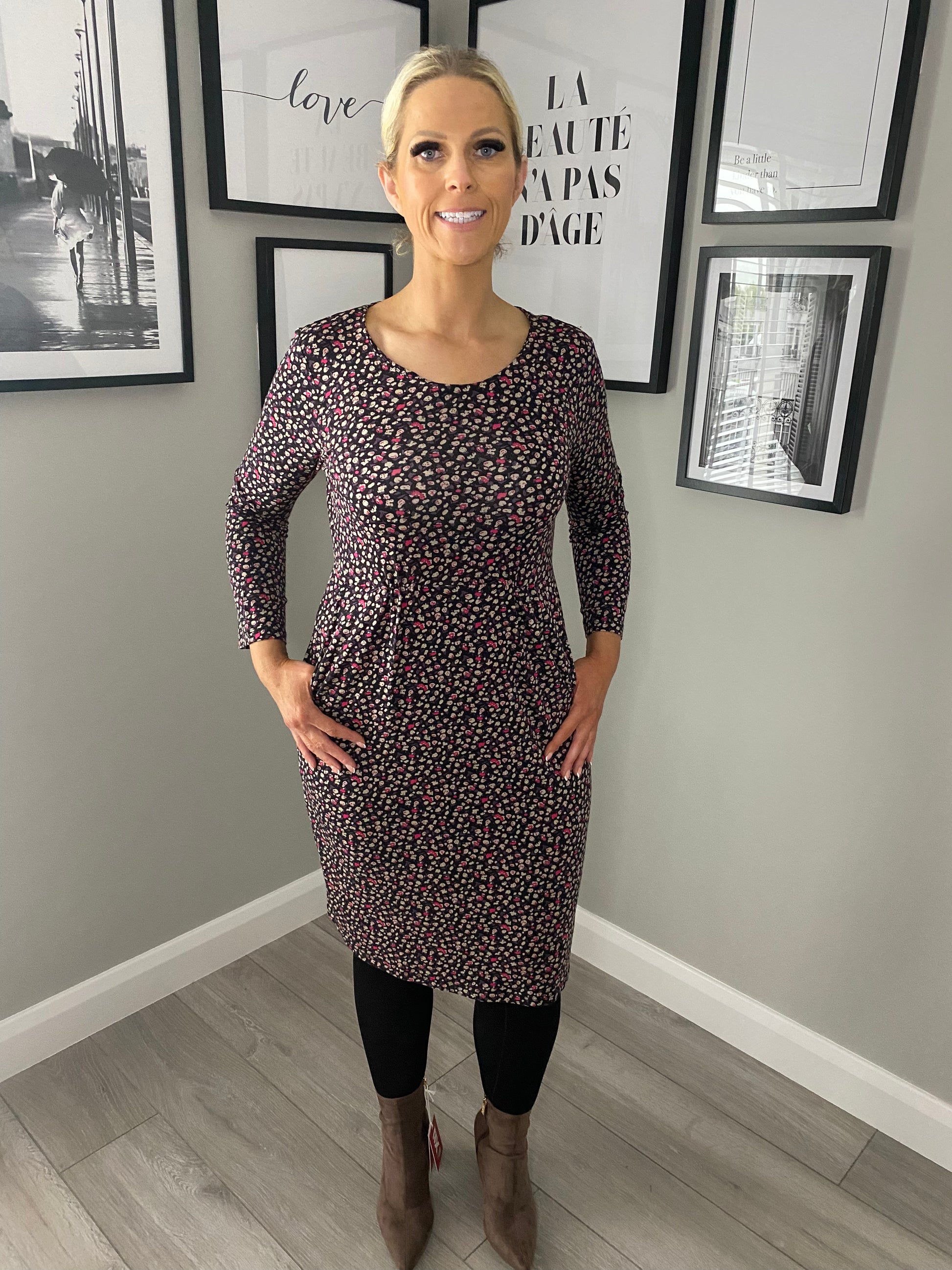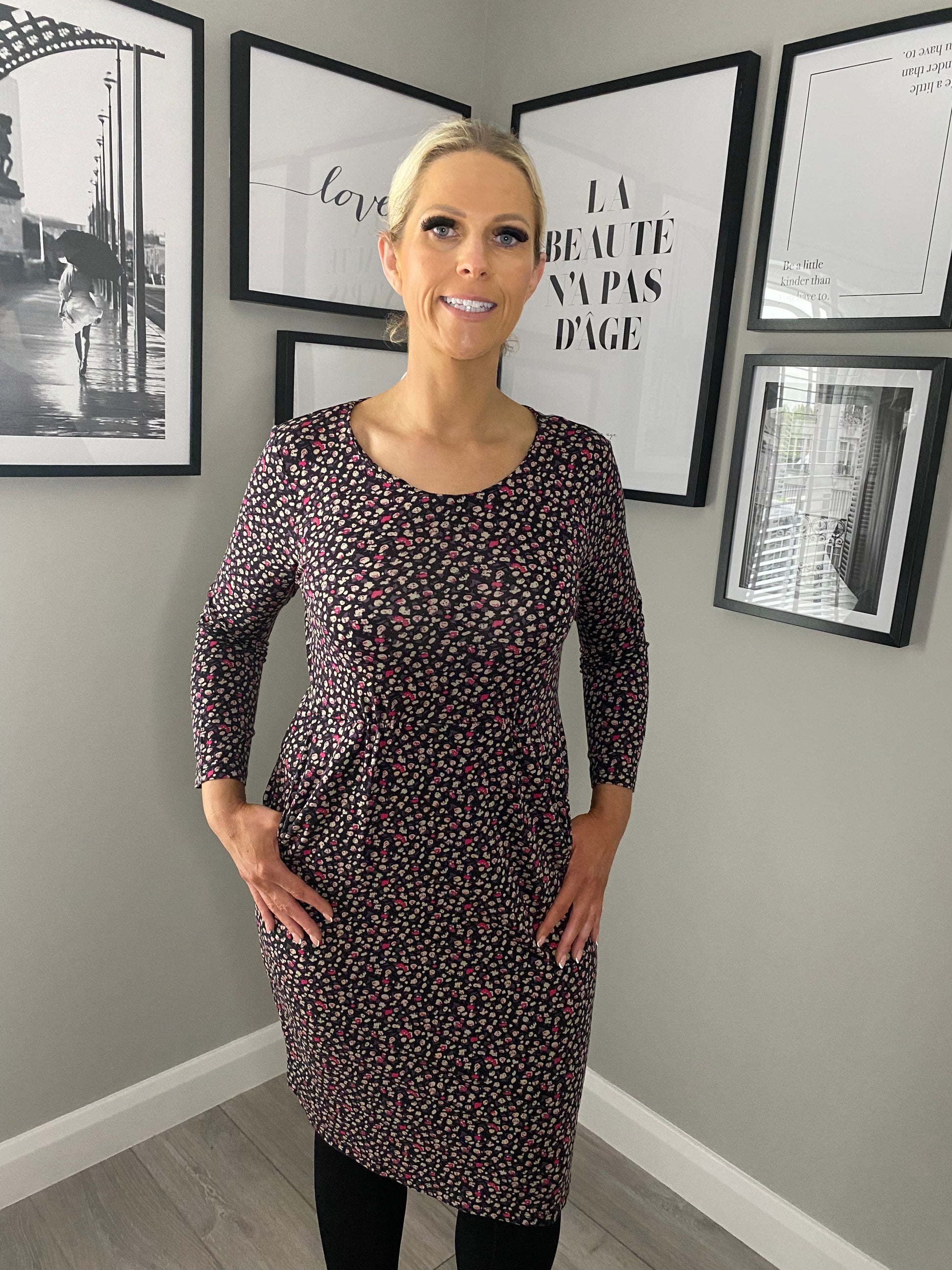 From the Pomodoro range this ones all comfort & style. On a charcoal grey soft jersey base with light stretch it's printed throughout in a speckled ditsy floral design in pinks & taupes. It's finished with double front pockets just under the flattering waistline. We styled effortlessly with our XTI taupe sock boots.