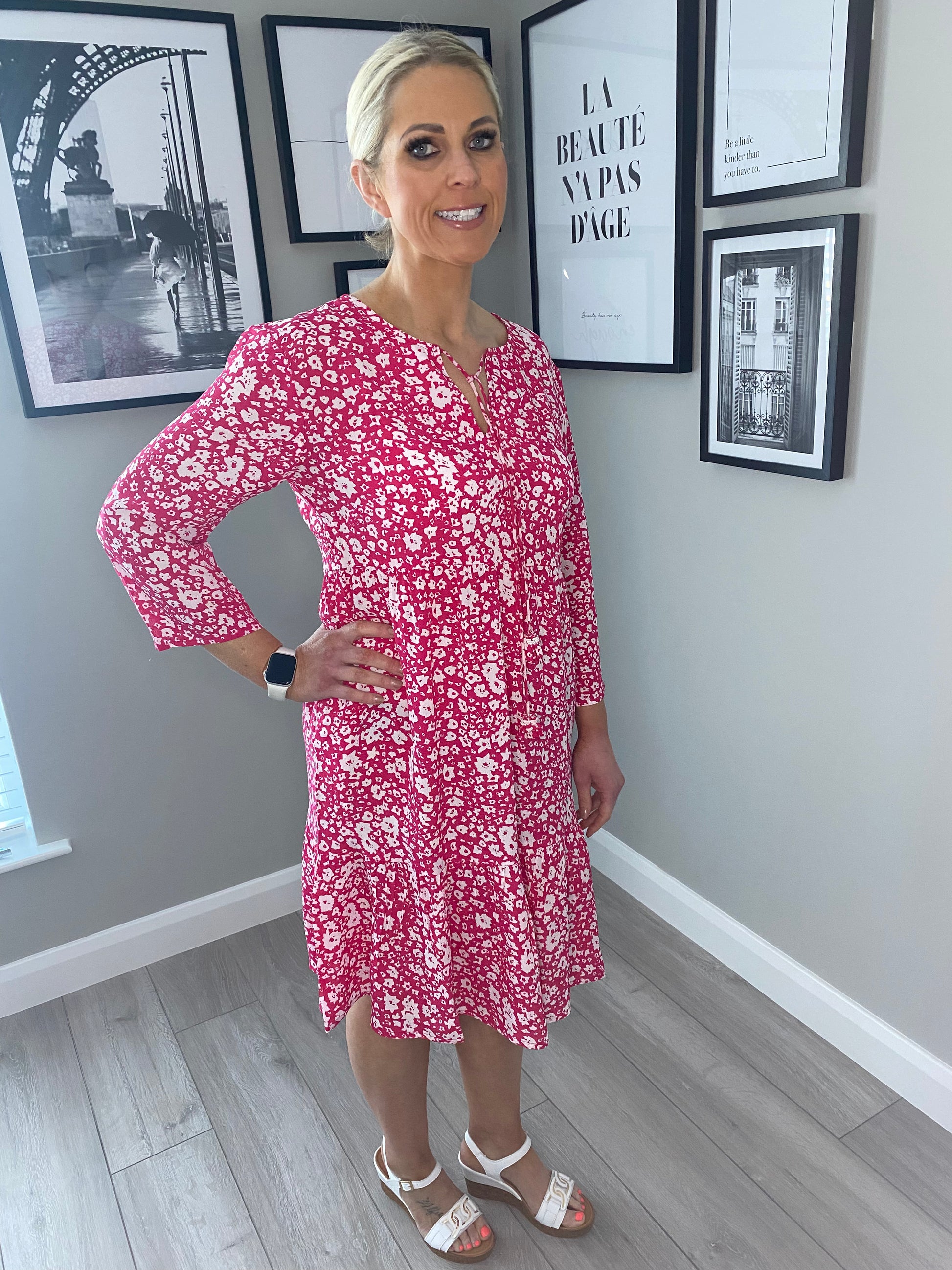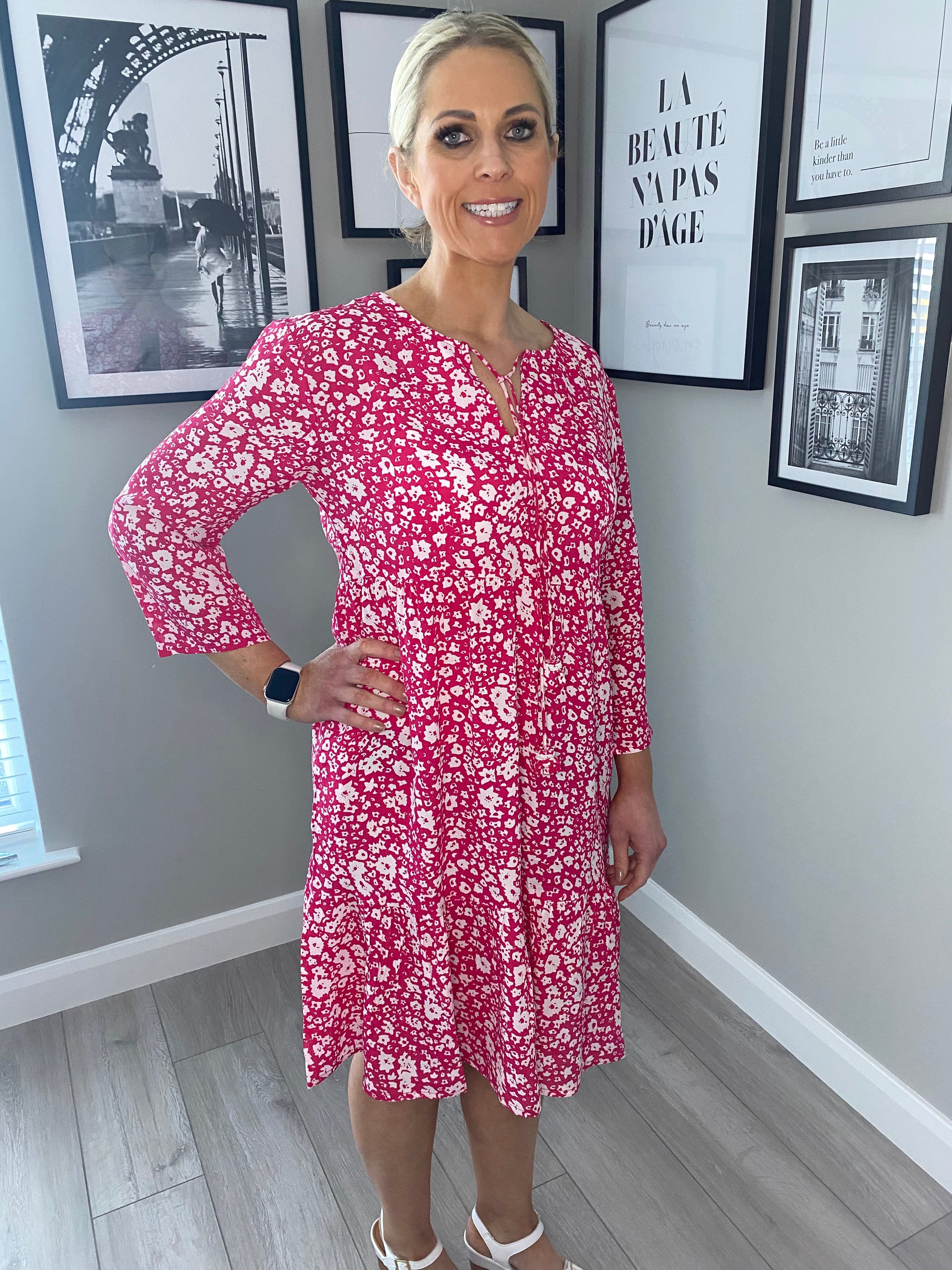Pomodoro 'Fleur' two toned ditsy print tea dress (full skirt to just below the knee). 100% viscose & with tassel tied neck. We've teamed with our Marco Tozzi white wedge sandals for a smart casual look but could easily be dressed up or down accordingly! Generous fitting!,