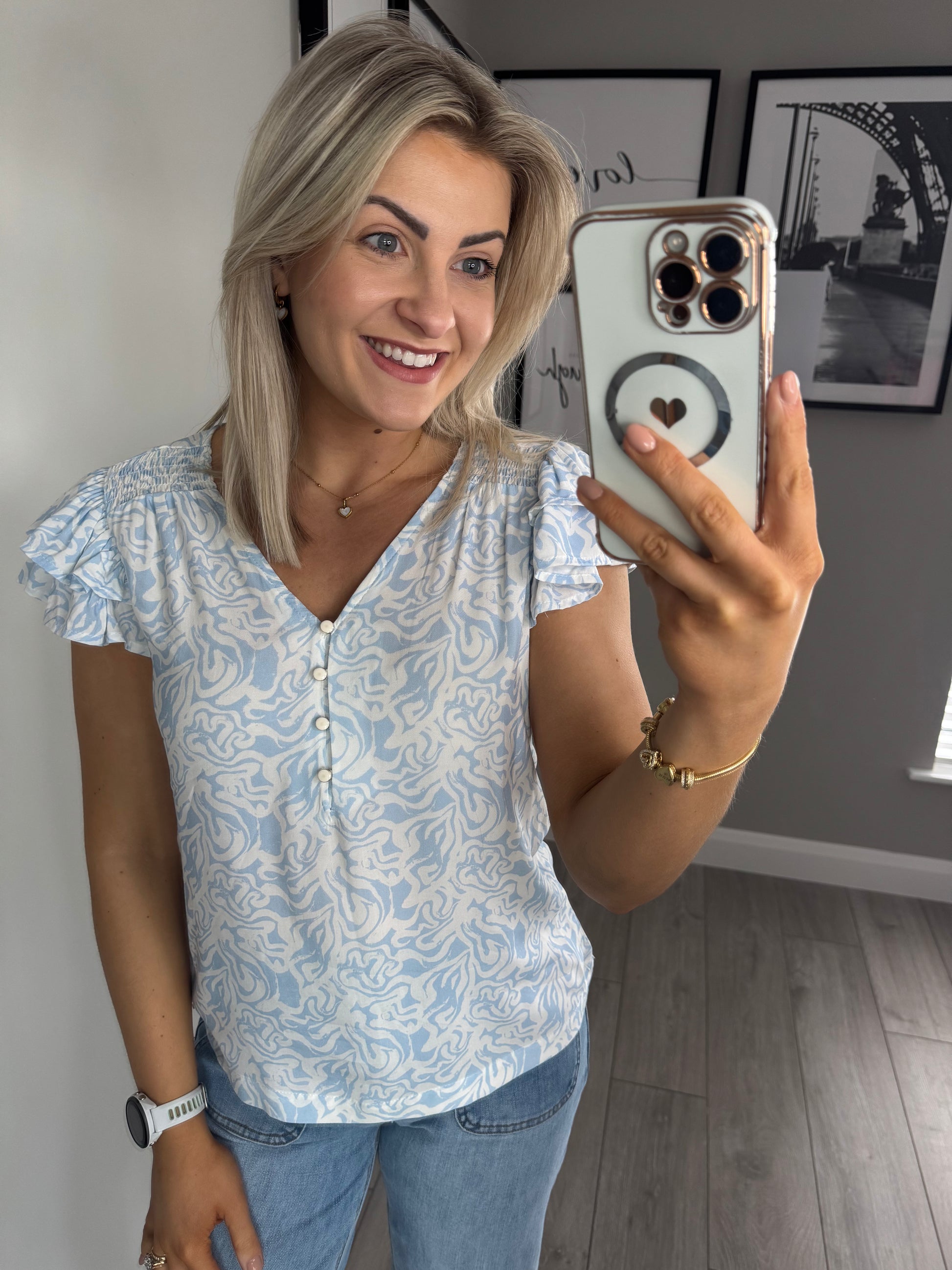 -Rant & Rave blue & white printed top with V neckline, pearl buttons & ruffled cap sleeves.