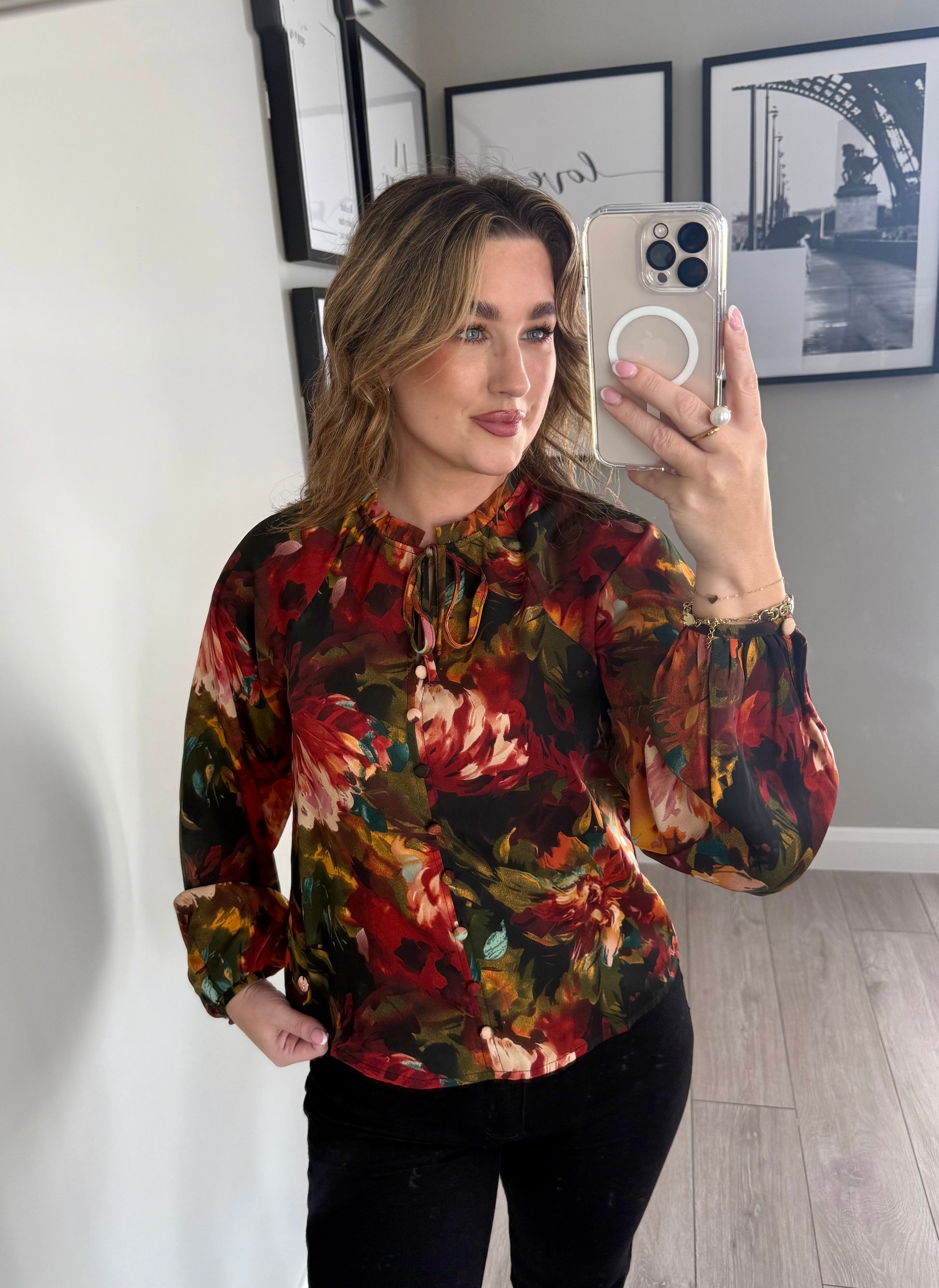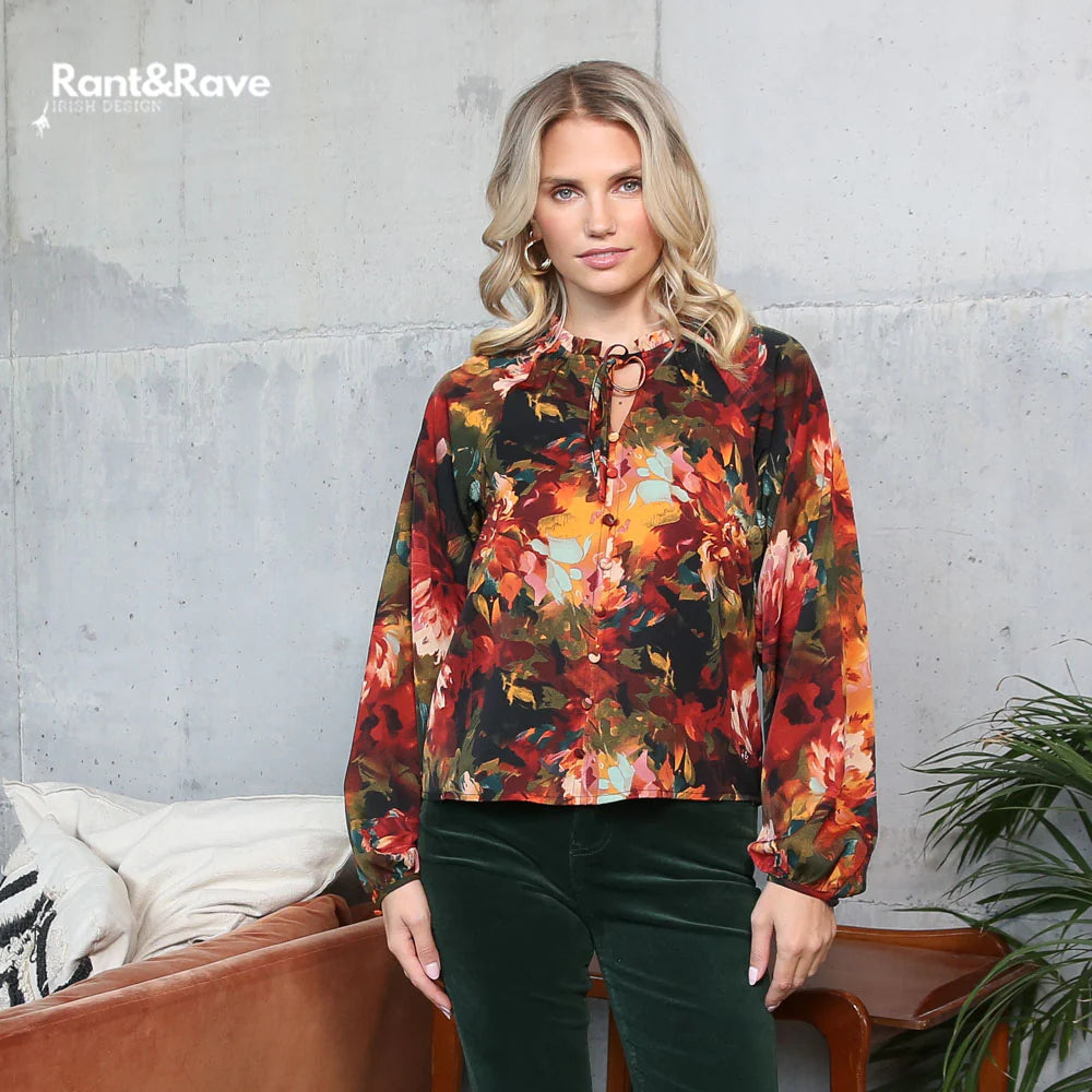 -Rant & Rave multi Billie top is matching everything! A unique blend of greens, rusts, black & orange its sitting with any colour base. It's finished with a stunning V tie neckline with small frill & long cuffed sleeves.