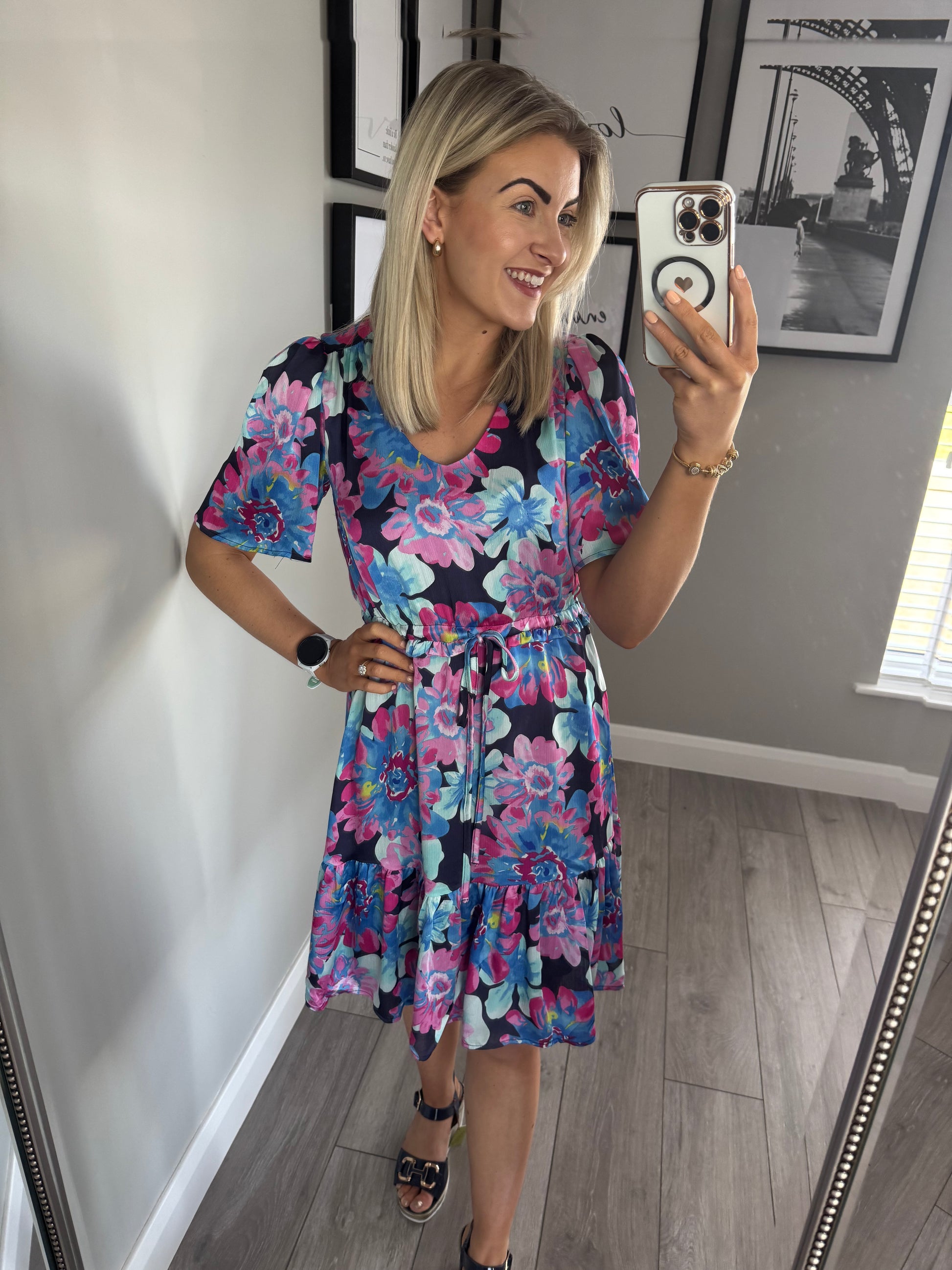 -Rant & Rave navy multi floral dress. Knee length with V neckline, short floaty sleeves & elasticated tie waistband.