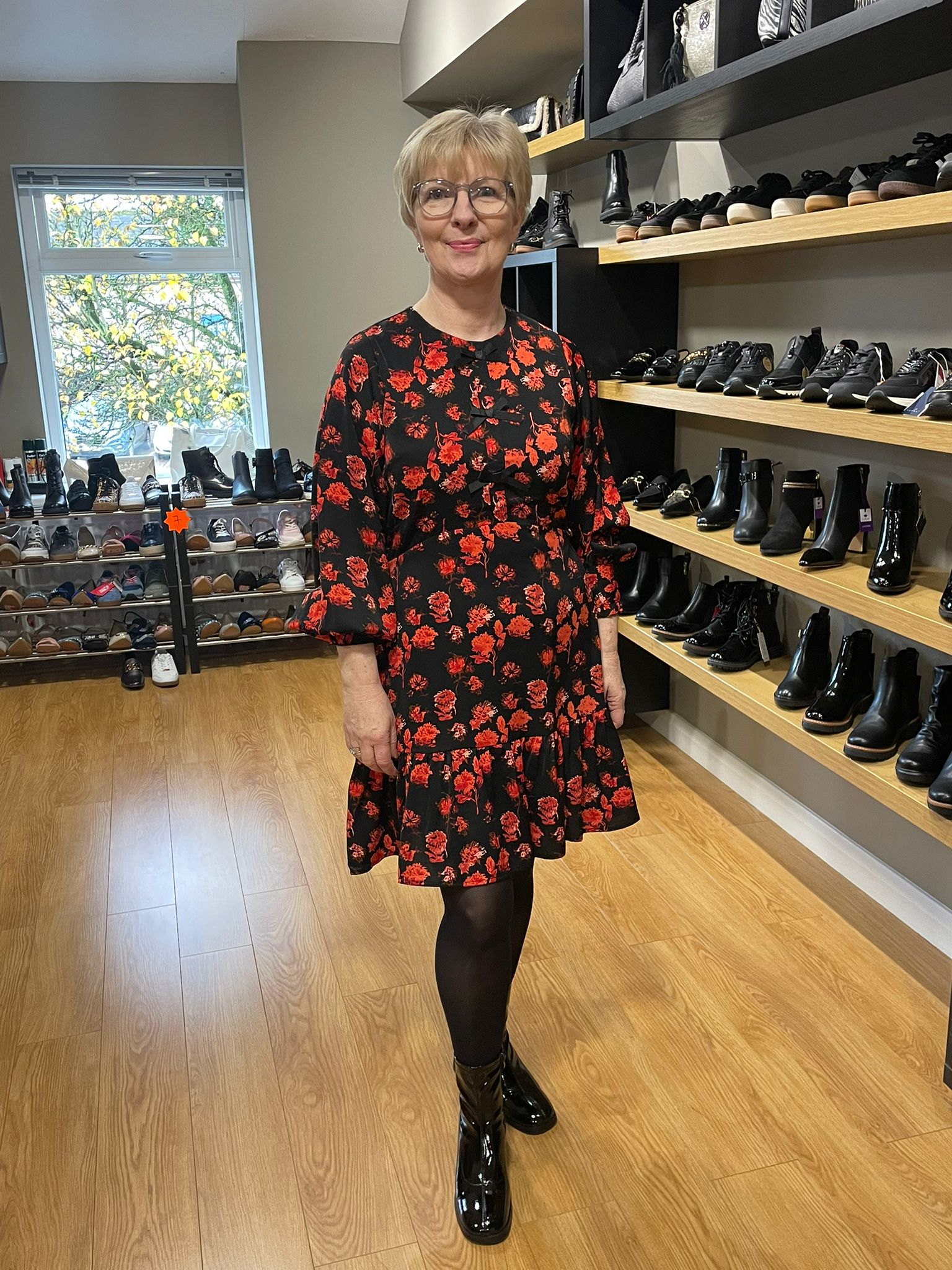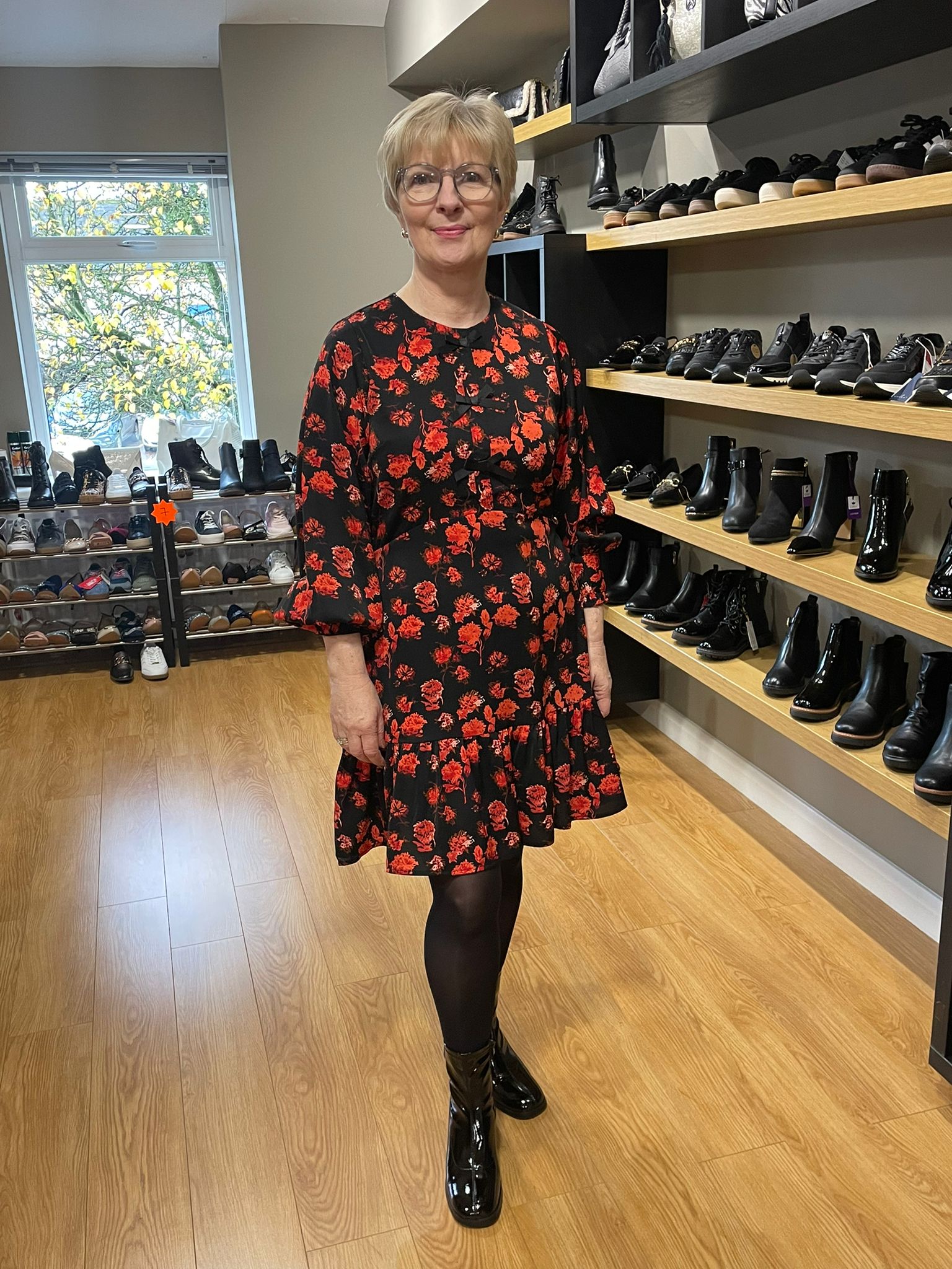 -Rant & Rave red & black bold floral printed dress. The Daina dress sits just above the knee with a lightly flared hemline, three quarter sleeves & delicate bow detail draping from the neck to waist.