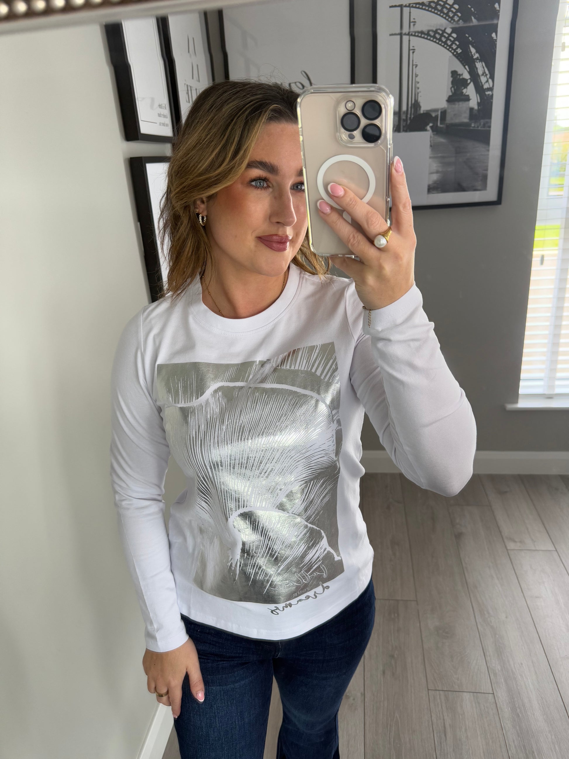 -Rant & Rave long sleeved white tee with metallic design motif to the centre. The ideal layer this Autumn!