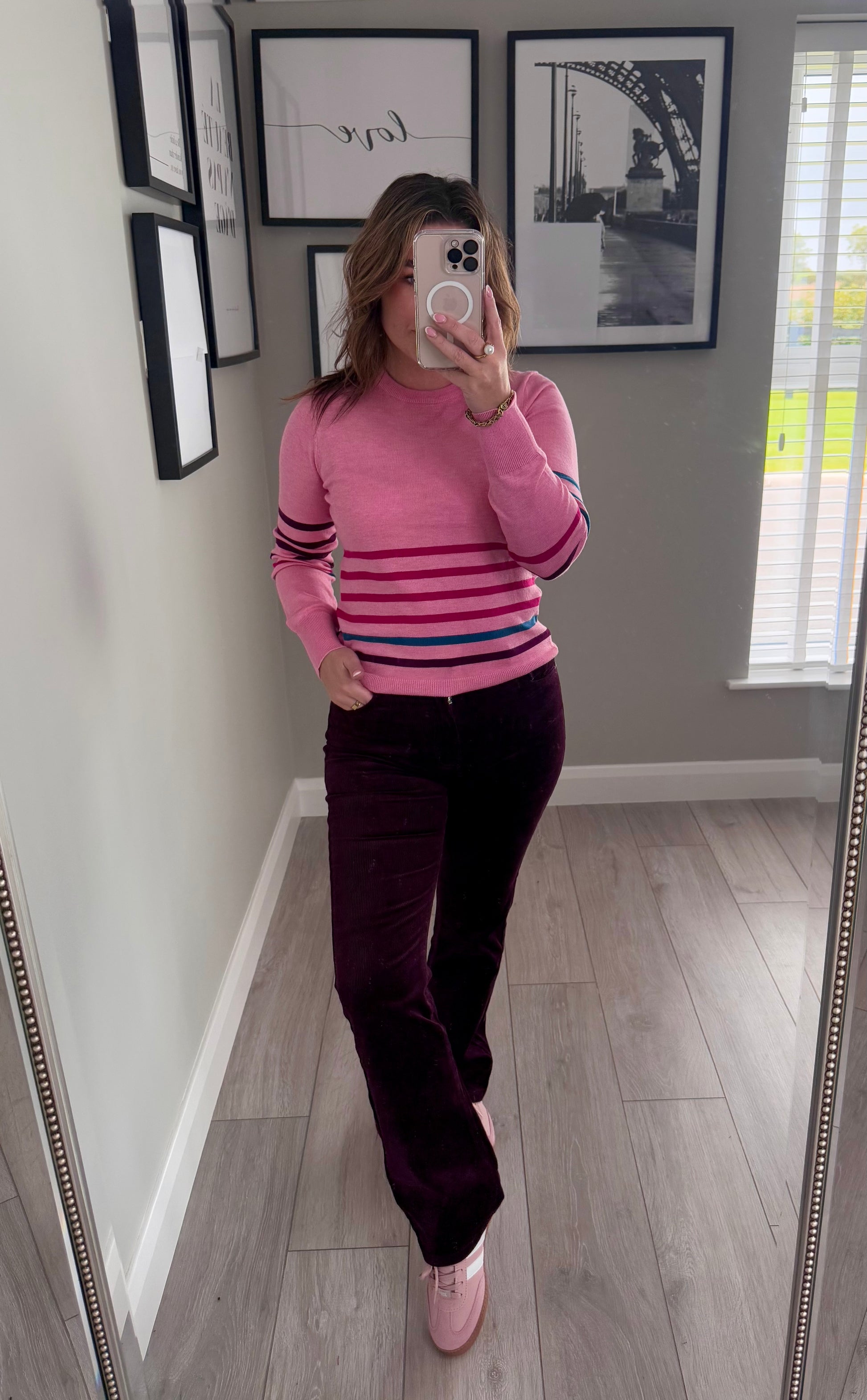 -Rant & Rave bootcut cord jean in plum. The bootcut style is partially fitted, flattering to the hips & thighs before falling to a fairly straight hem. Zip & button fastening.