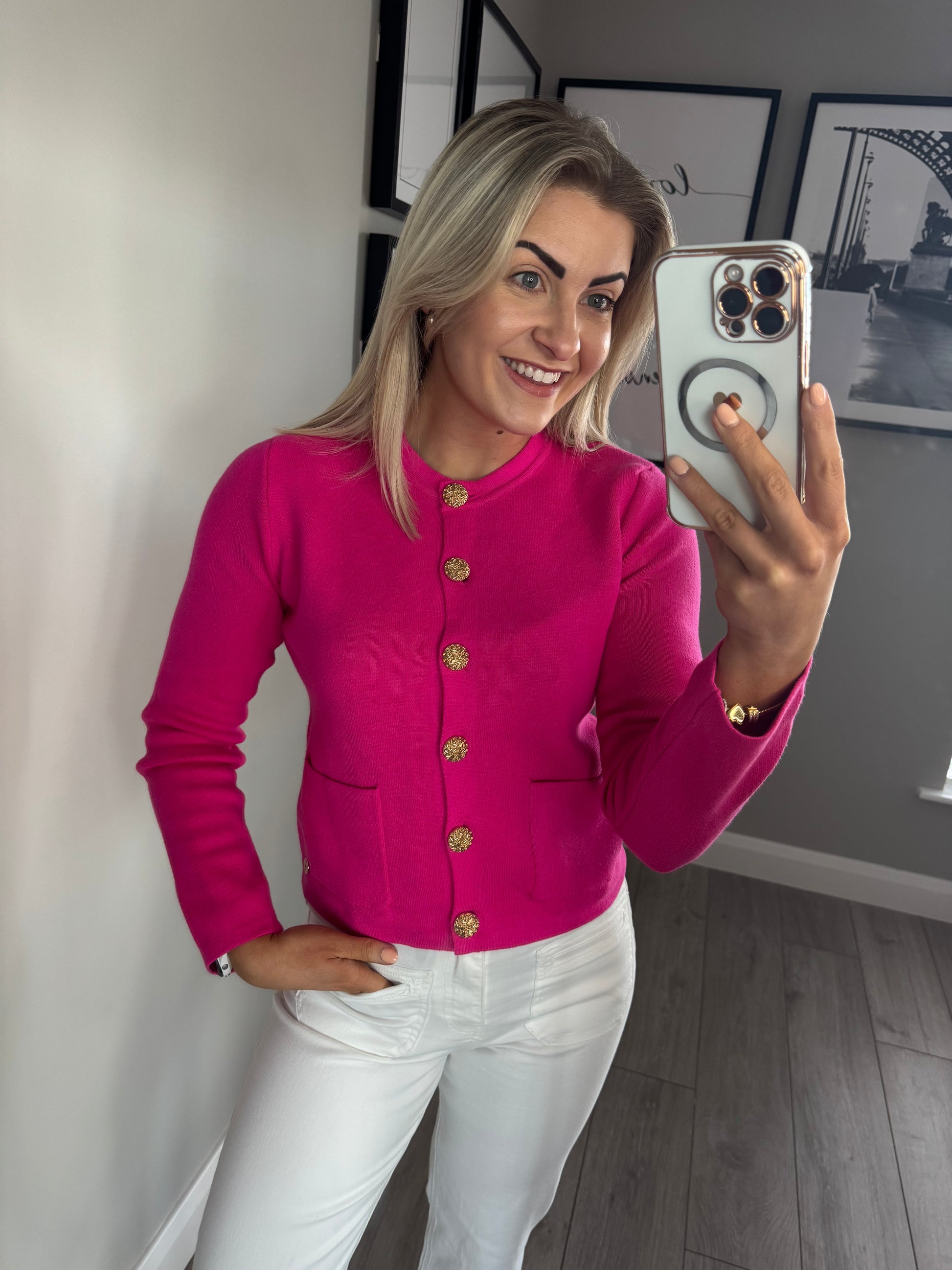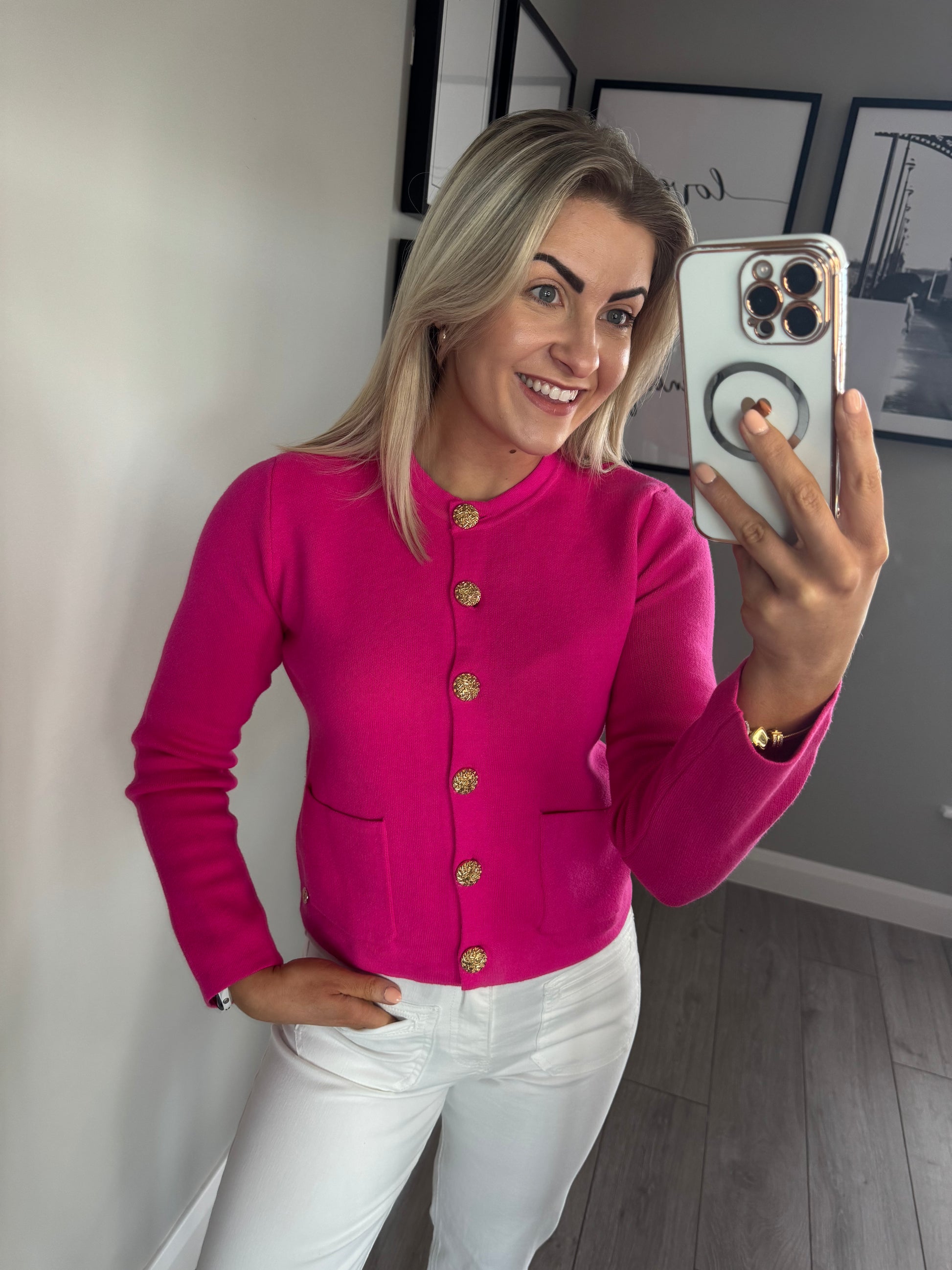 -Rant & Rave hot pink cardigan (can be wore open or closed) with striking gold buttons & double pockets.