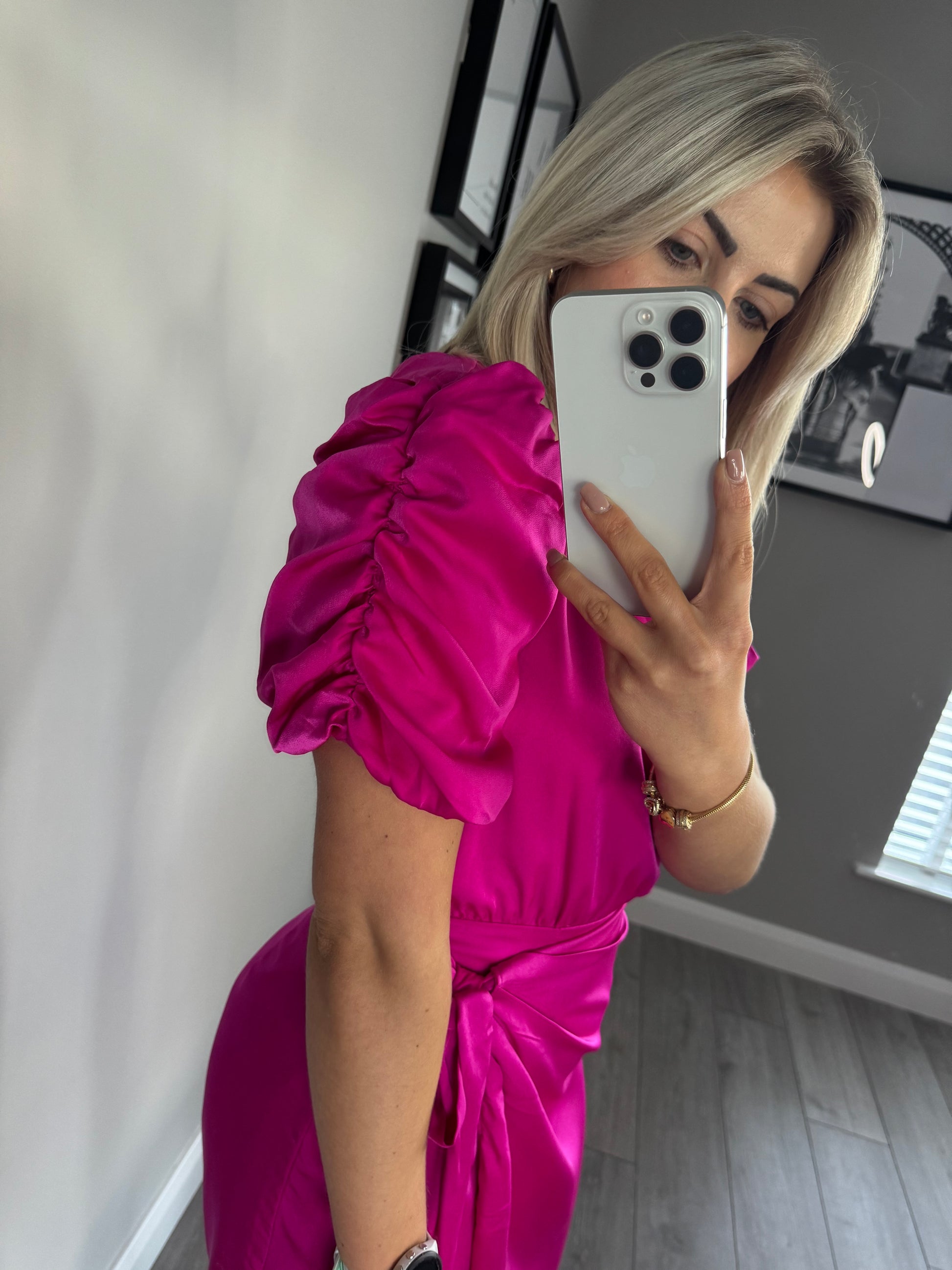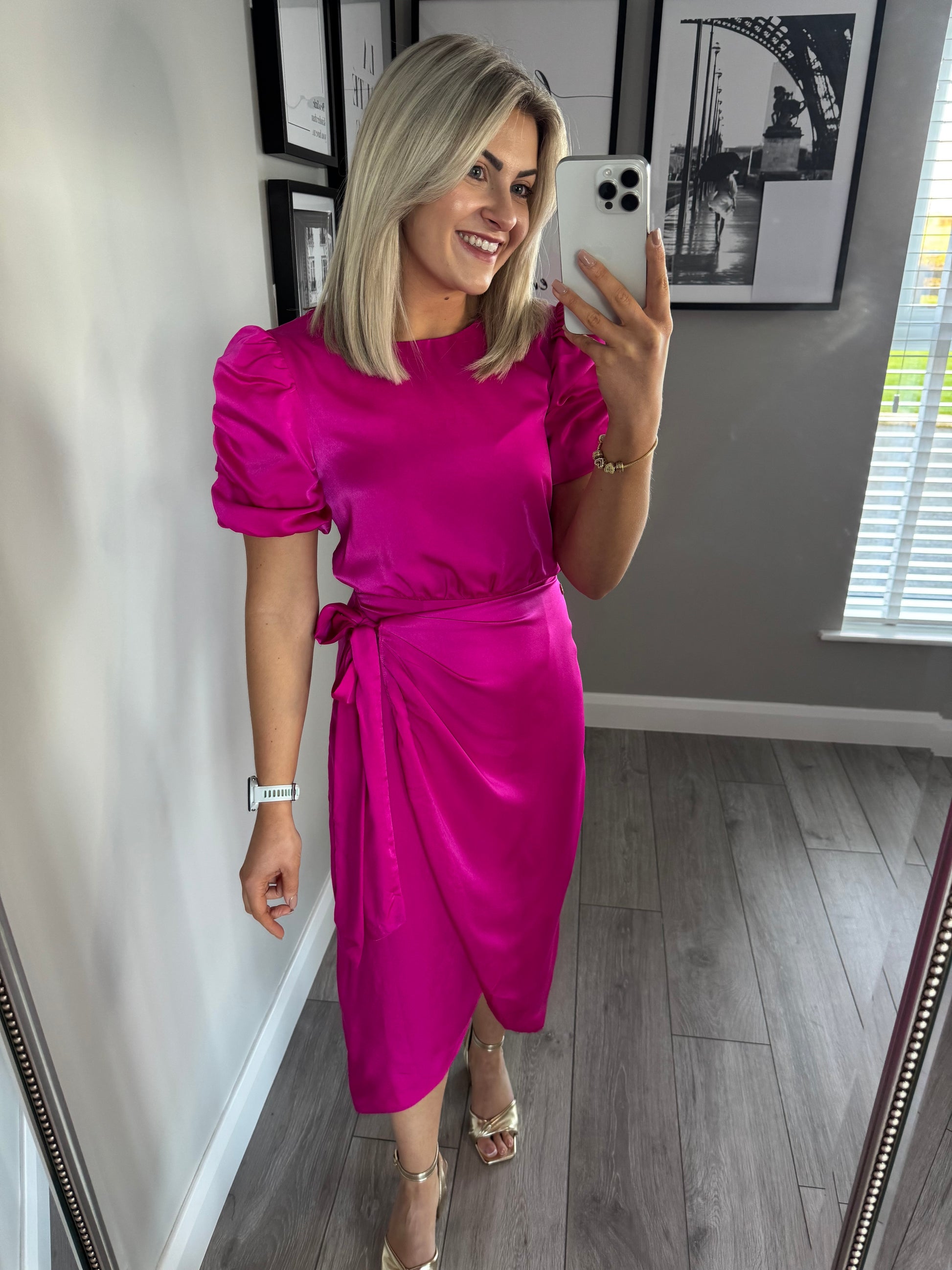 -Rant & Rave magenta silk finish dress with wrap style skirt (scalloped hem), tie detail & short ruffled sleeve.