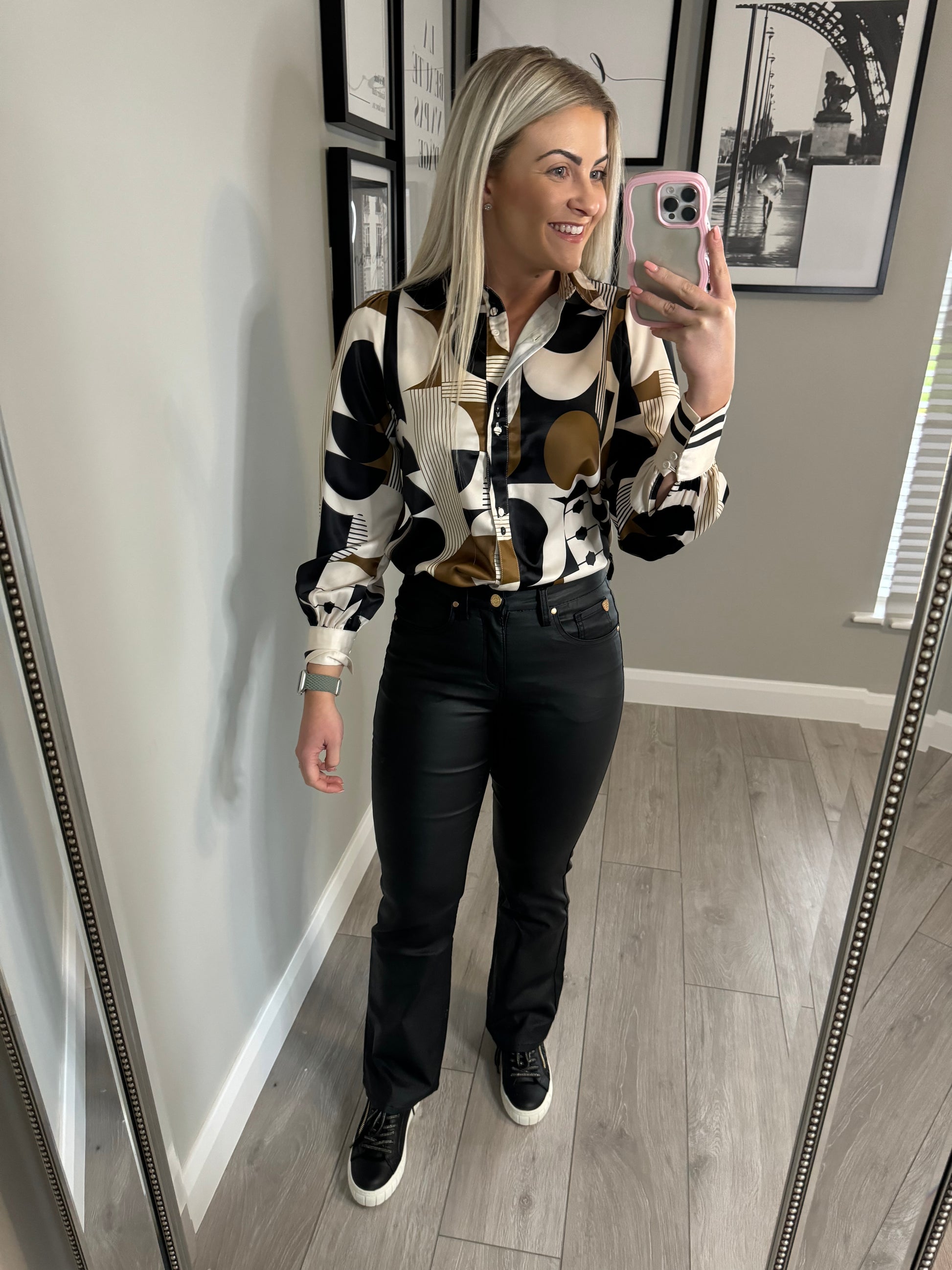 -Rant & Rave bootcut faux leather jean. Single button & zip fastening in gold hardware.