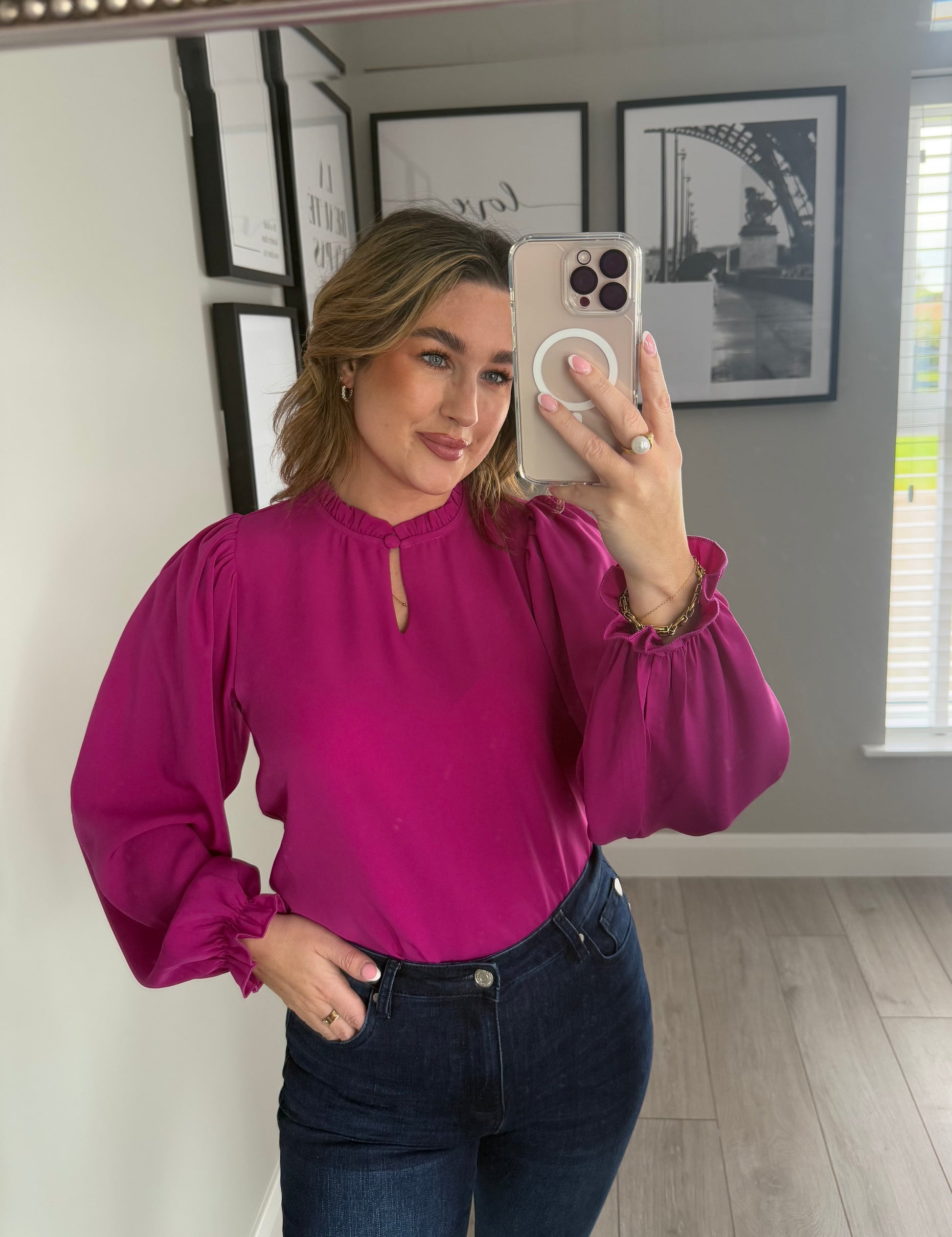 -Rant & Rave magenta plain blouse. An effortless wear with frill detail to the high neckline & cuffed sleeves, finished beautifully with small keyhole/button fastening.