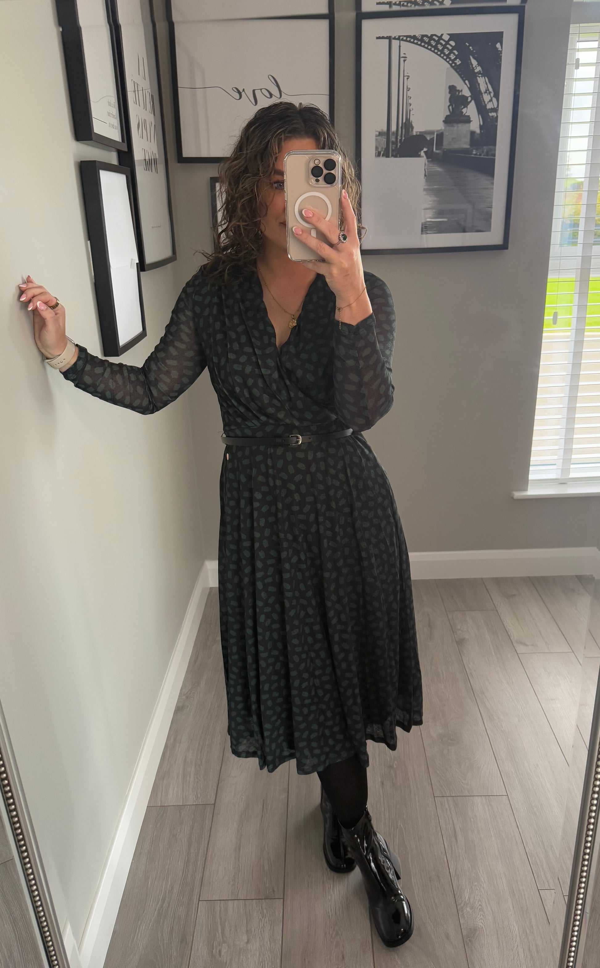 -Rant & Rave two toned black & forest green printed dress. Flattering V wrap effect neckline (stitched in) with lightly flared skirt & sheer full length sleeves. Comes with matching black belt.