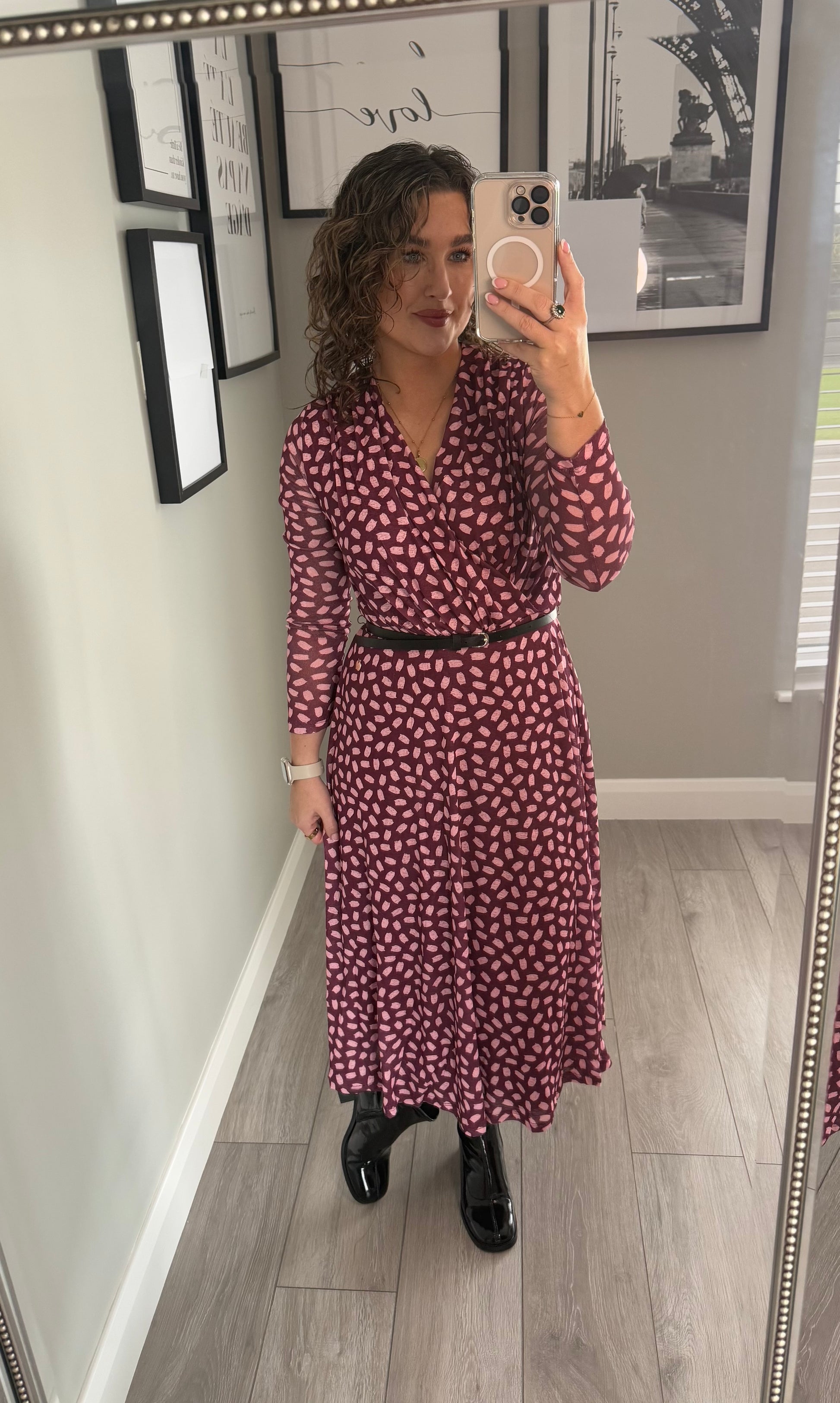 -Rant & Rave two toned berry & pink printed dress. Flattering V wrap effect neckline (stitched in) with lightly flared skirt & sheer full length sleeves. Comes with matching black belt.
