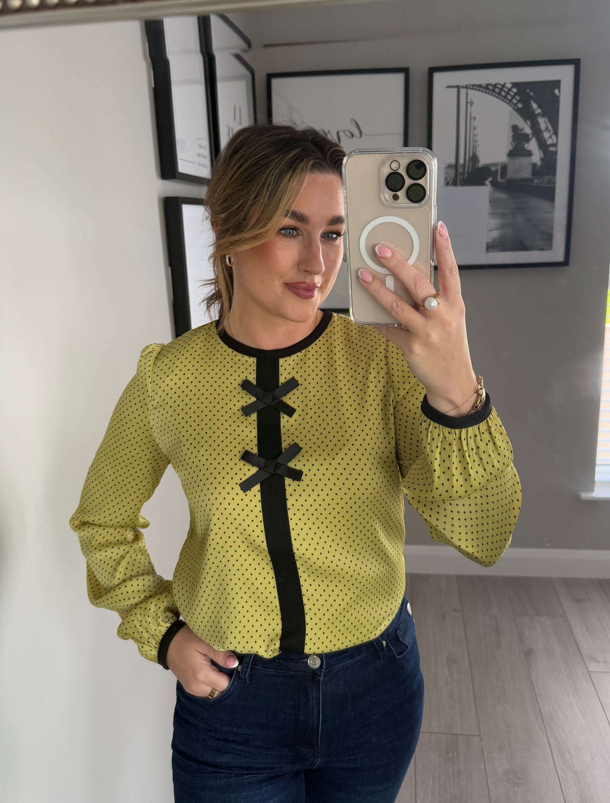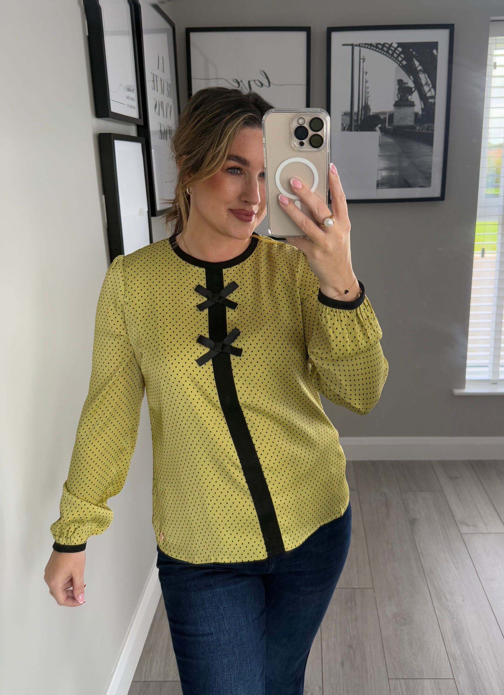 -Rant & Rave lime green & black spot top with round neck, full length sleeve & silk effect bow detailing to the centre. A stunning piece for black trousers or skirts!
