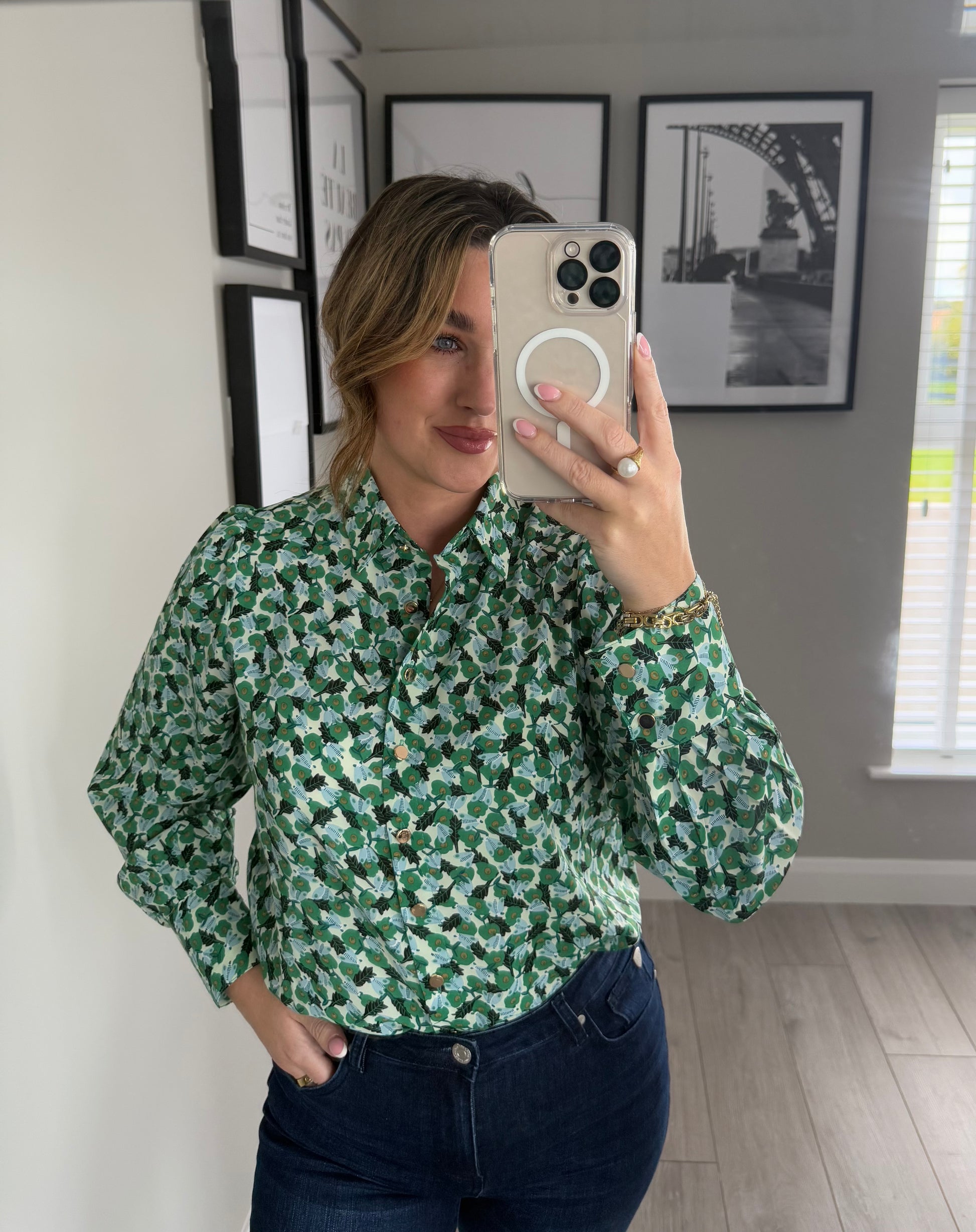 -Rant & Rave green printed blouse. In green multi (light & forest) Jasleen has a classic collar & button through (gold buttons) from collar to hem.