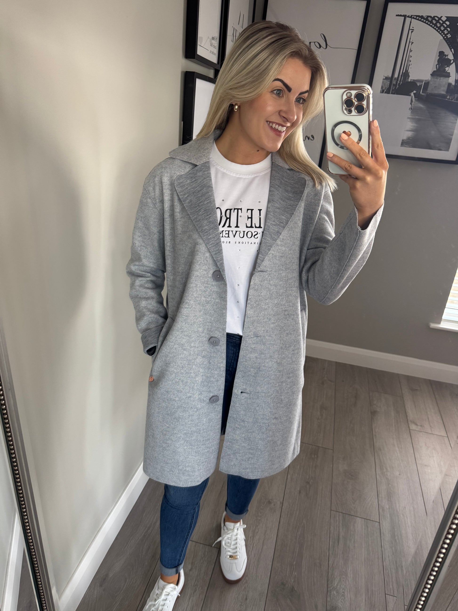 -Rant & Rave grey (blue) light coatigan with double pockets, flat lapel collaring & triple button fastening.