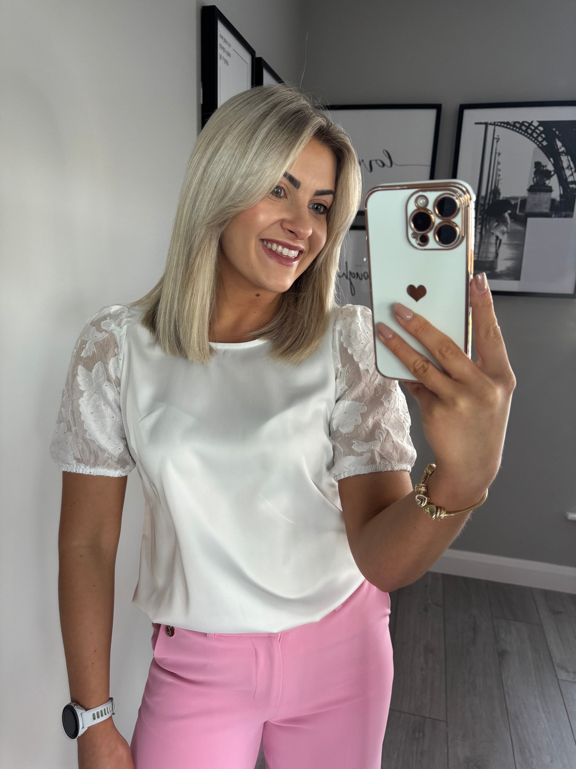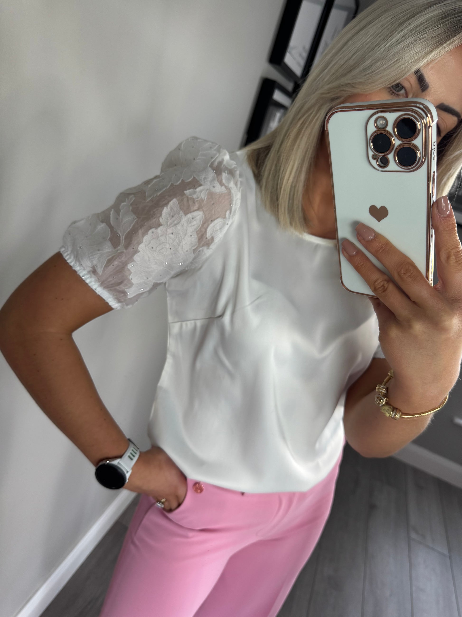 -Rant & Rave cream silk finish top with short self printed/silver embellished sleeves.