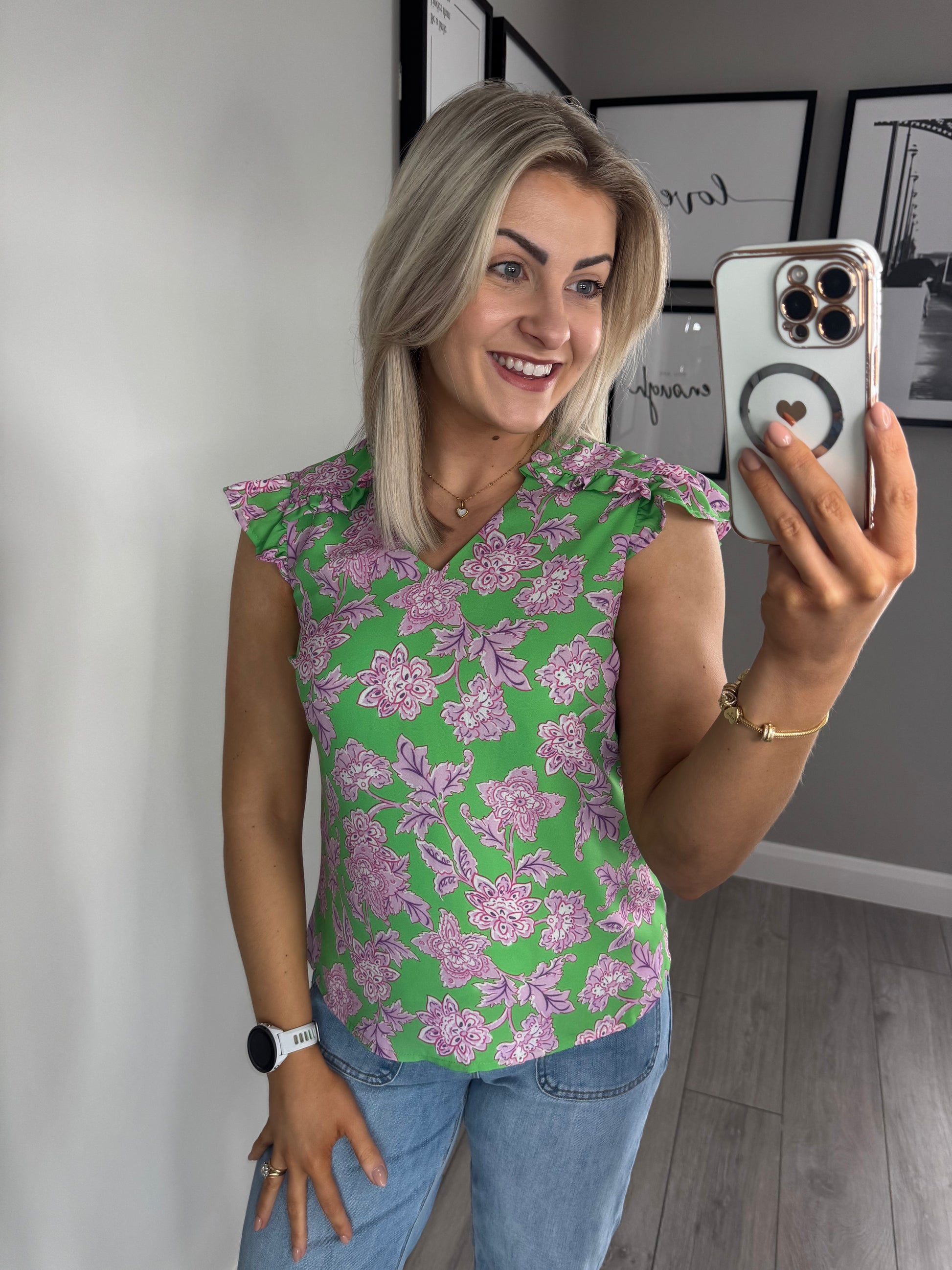 -Rant & Rave green & magenta printed top with V neckline & ruffled cap sleeves.