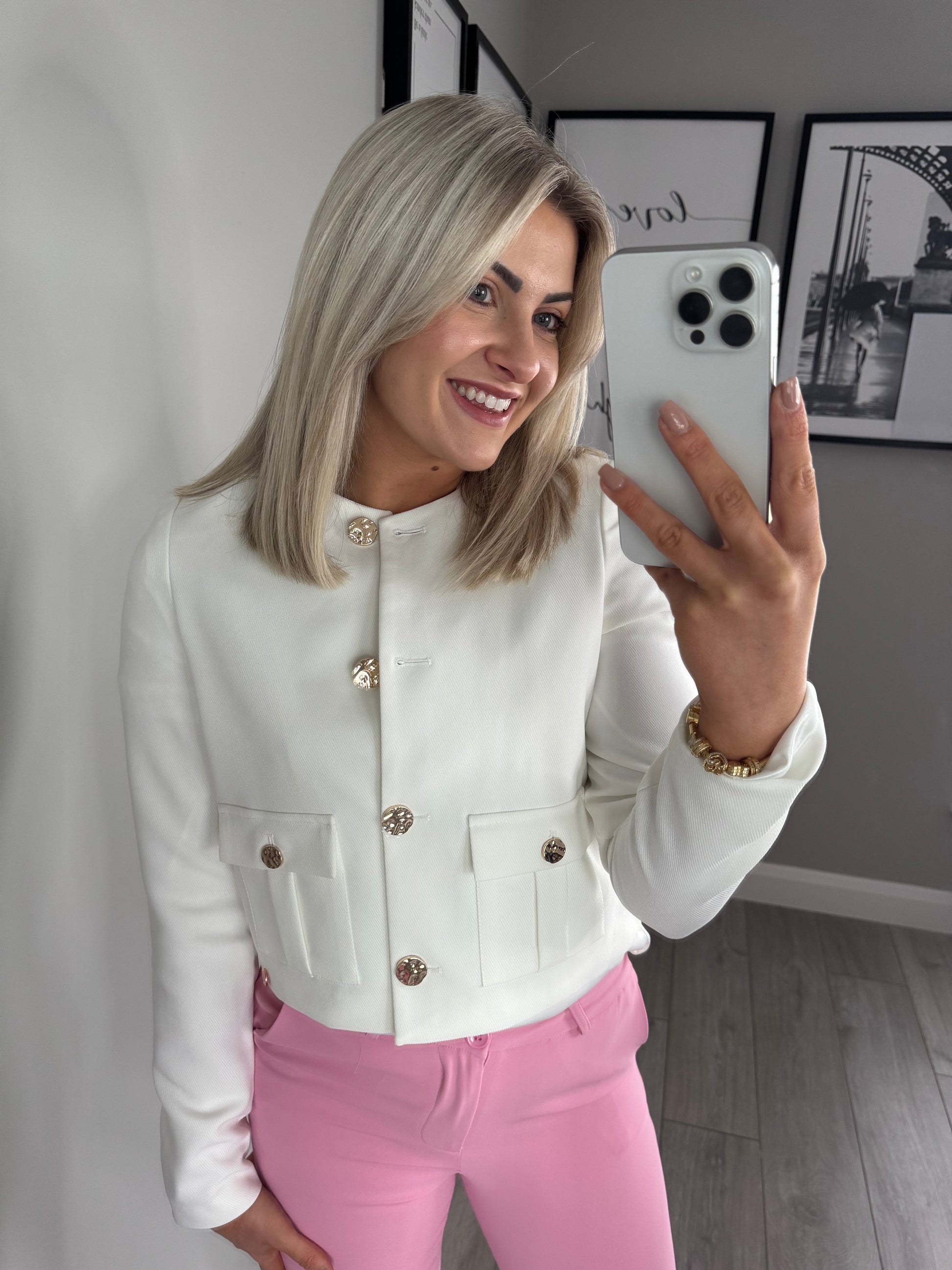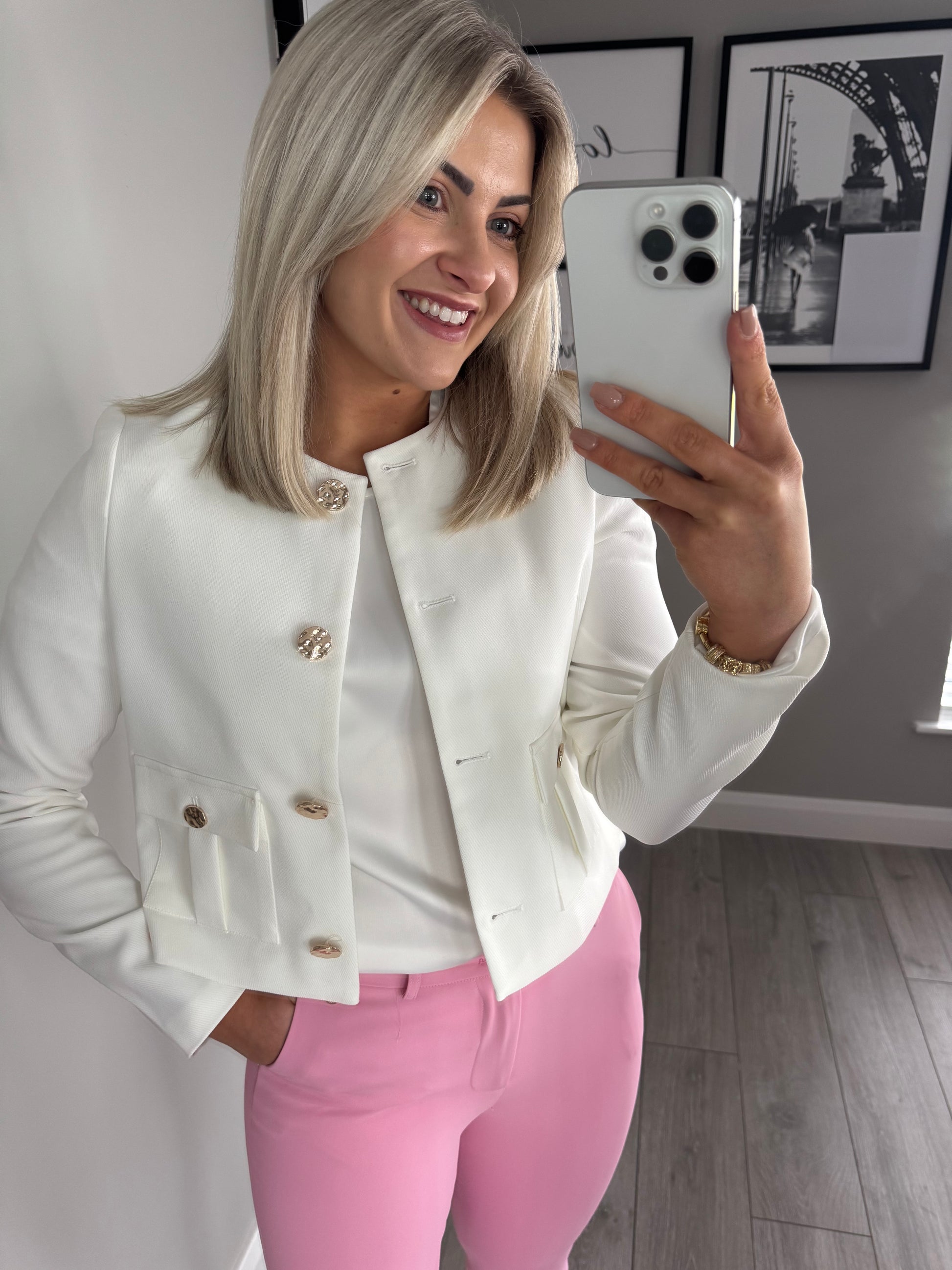 -Rant & Rave short white jacket with large gold button & pocket detail. The ideal jacket for over your Spring tops & dresses.