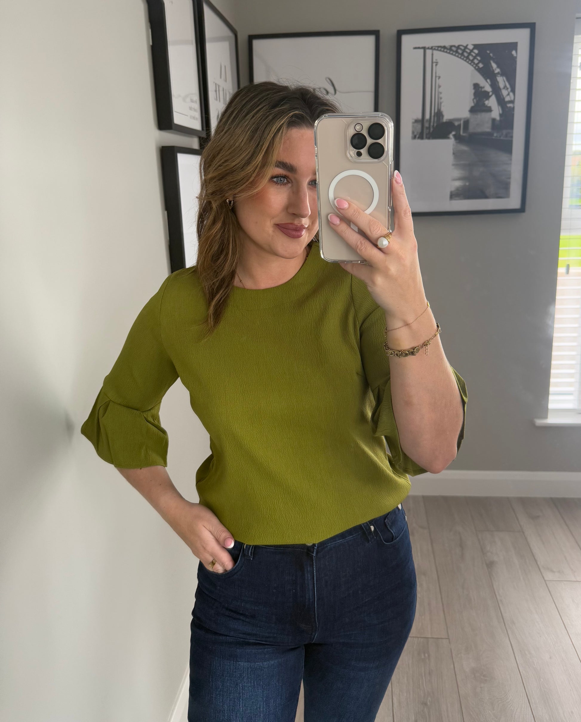 -Rant & Rave plain green top with half bell sleeves & round neck. Finished with zip closure to the back of neck.